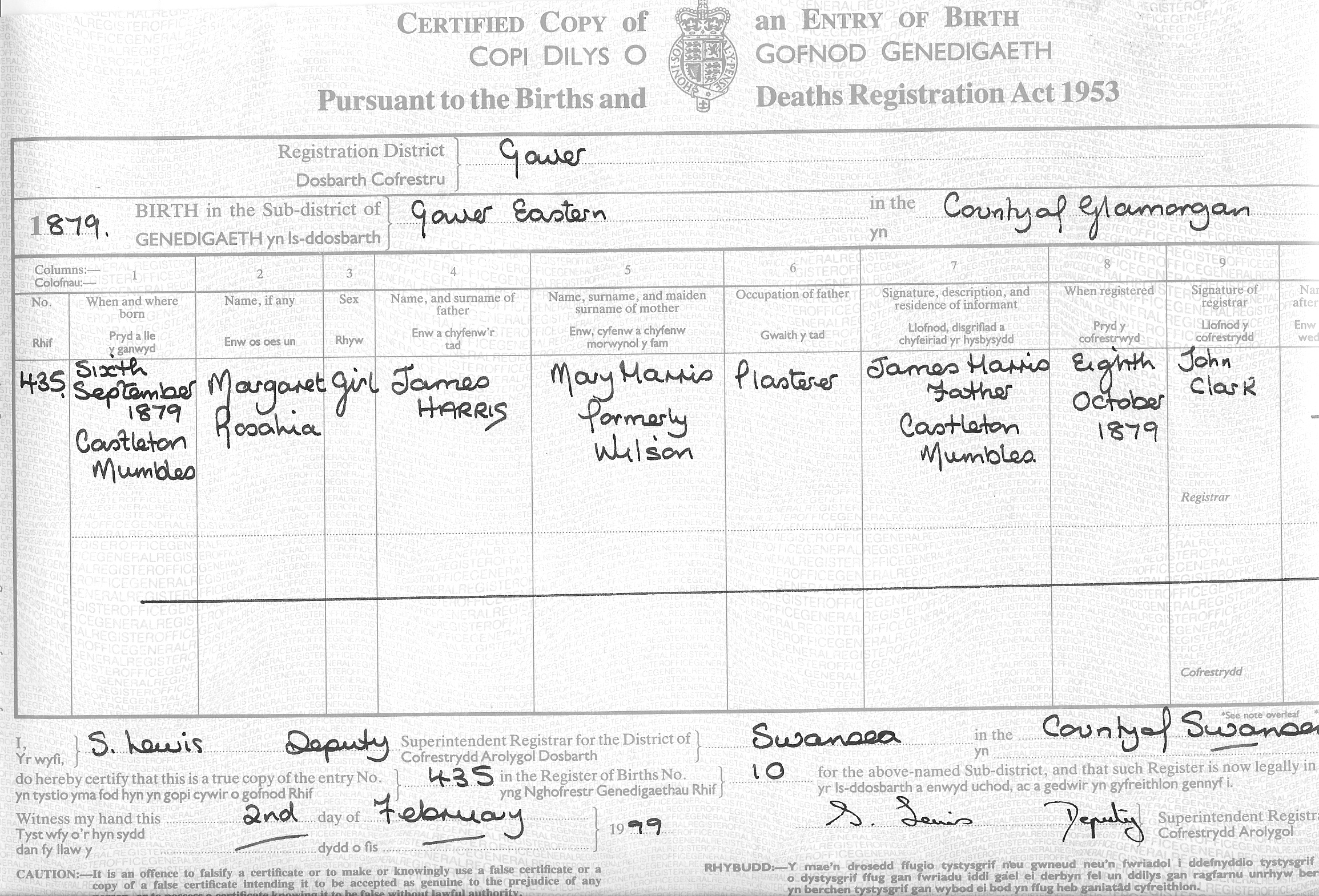 England and Wales, birth certificate for Margaret Rosalia Harris, born Sixth September 1879; citing 11a/665/435, December quarter 1879, Gower registration district, Gower Eastern in the County of Glamorgan sub-district; General Register Office, Southport. Cit. Date: Feb 1999. Cit. ID: CL 333095, Surety: 4; Gower