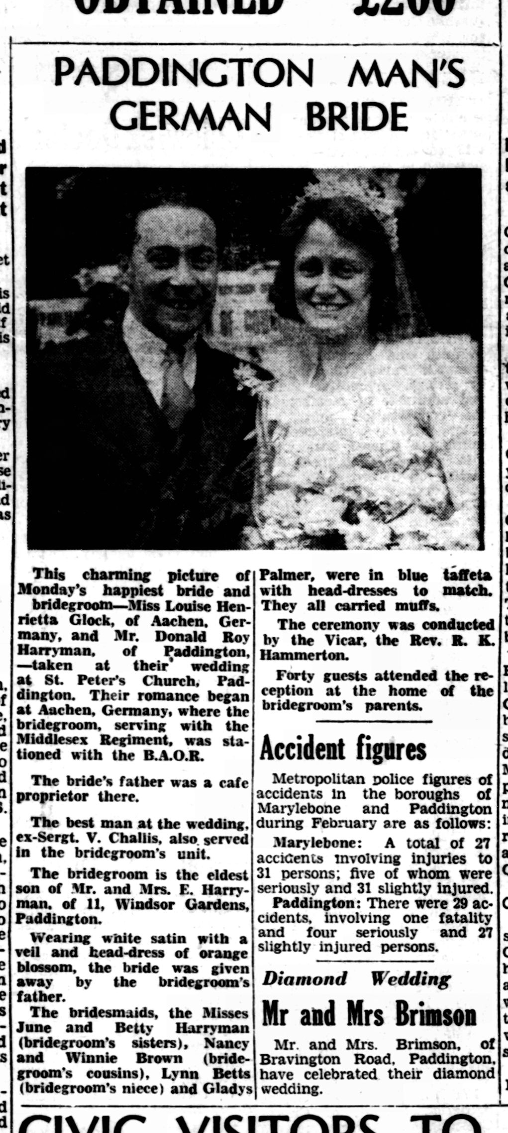 • Newspaper Article: marriage march 1947, 22 Mar 1957, Paddington. Donald married Louise Henrietta Glock on 22 Mar 1947 in Paddington, Middlesex, England. (Louise Henrietta Glock was born in Germany and died after 1947.) |