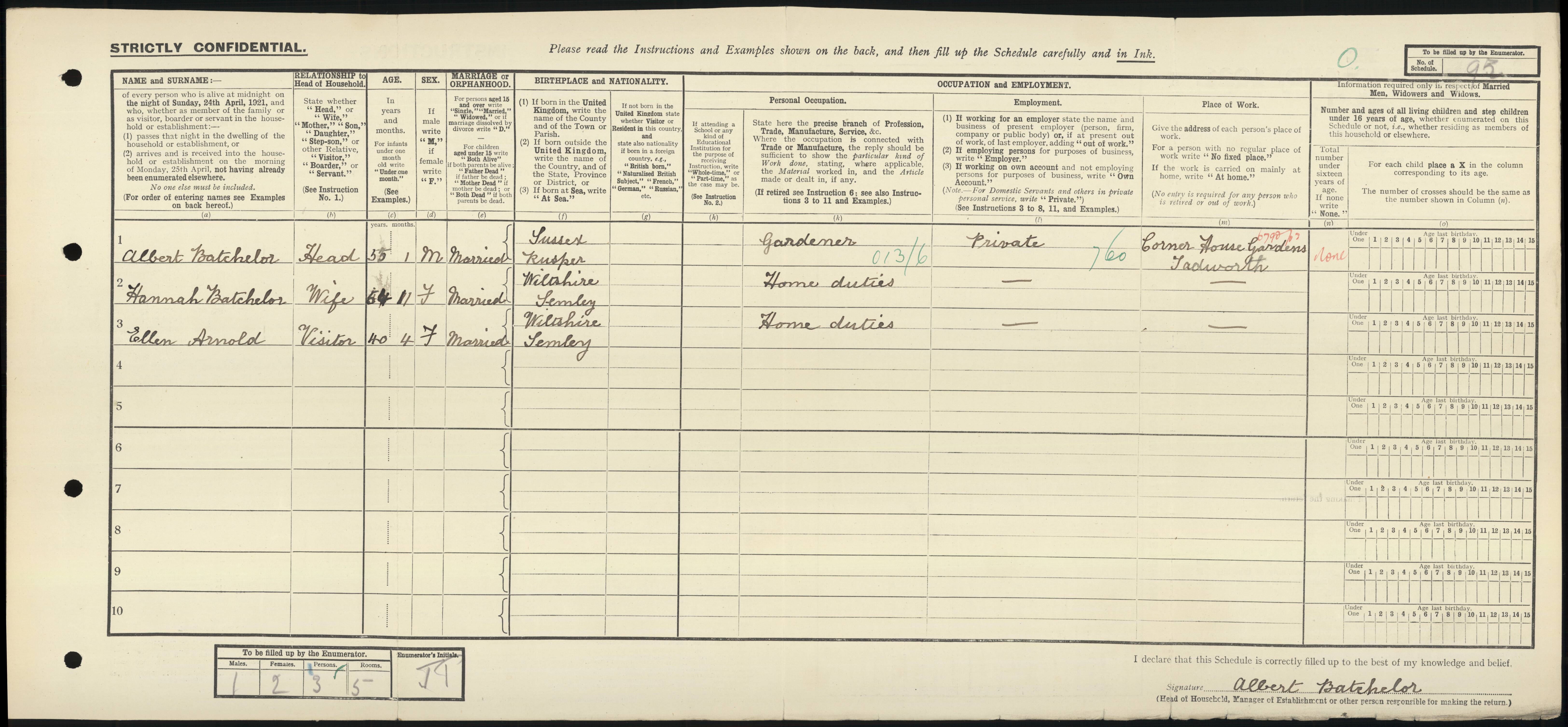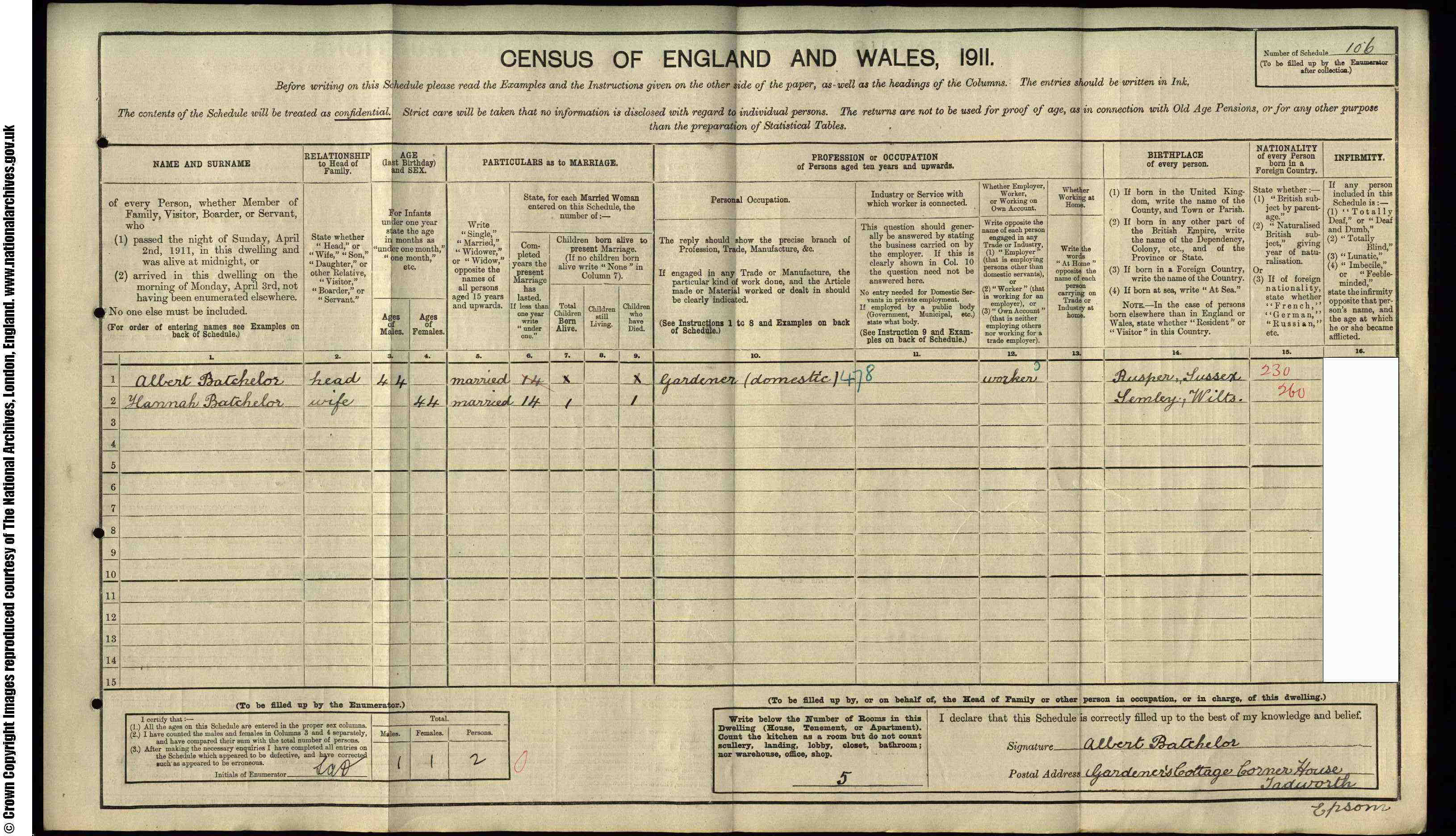 • Lived at: Lodge Corner House, 1921, Tadworth, Surrey. Hannah married Albert Batchelor on 1 Aug 1896 in Kingswood, St Andrew, Surrey, England. (Albert Batchelor was born circa 1867 in Rusper, Sussex and died after 1922.) |