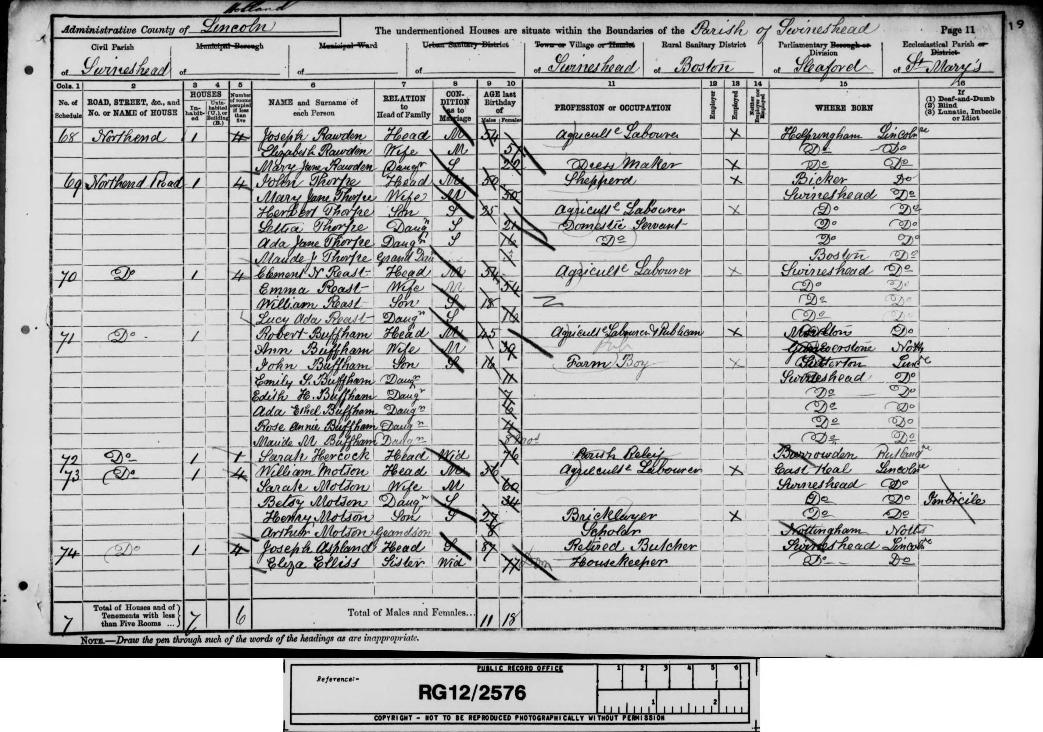 1 (1891 English and Welsh Census(London, TNA/Ancestry.co.uk, 1992) , Web site showing copies of original enumerator schedules) ID: CEN 1891 RG12, Freecen web page Piece: RG12/2555 Place: Bourn-Lincolnshire Enumeration District: 2. Cit. Date: 18 Apr 2004. Cit. ID: CEN 1891 RG12/2555. Surety: 3.