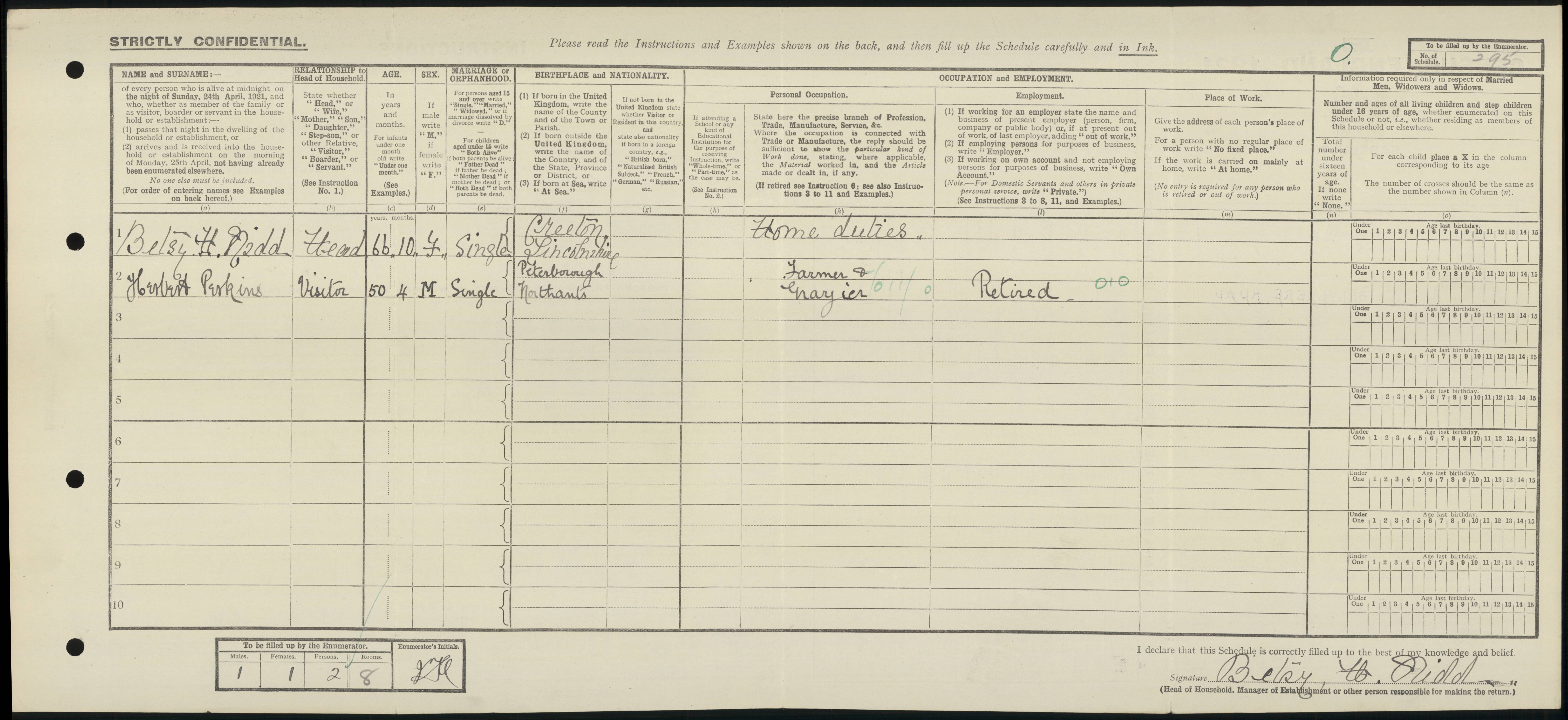 • Occupation: Home Duties, 1921, Penge. e 'visitor' Harold Parkins is listed as farmer. |