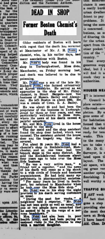 Cause of his death was Poisoning. Birth Notes: 7a 382 Boston Events • Lived at: 1 South Street, 1871, Little Humby. 3 • Lived at: Skeldyke, 1871, Kirton, Lincolnshire, England. 4 • Lived at: Skeldyke, 1881, Kirton, Lincolnshire, England. 5 • Lived at: 130 Nottinghill High Street, 1891, Kensington, London, England. • Occupation: Chemist, 1891, Kensington, London, England.