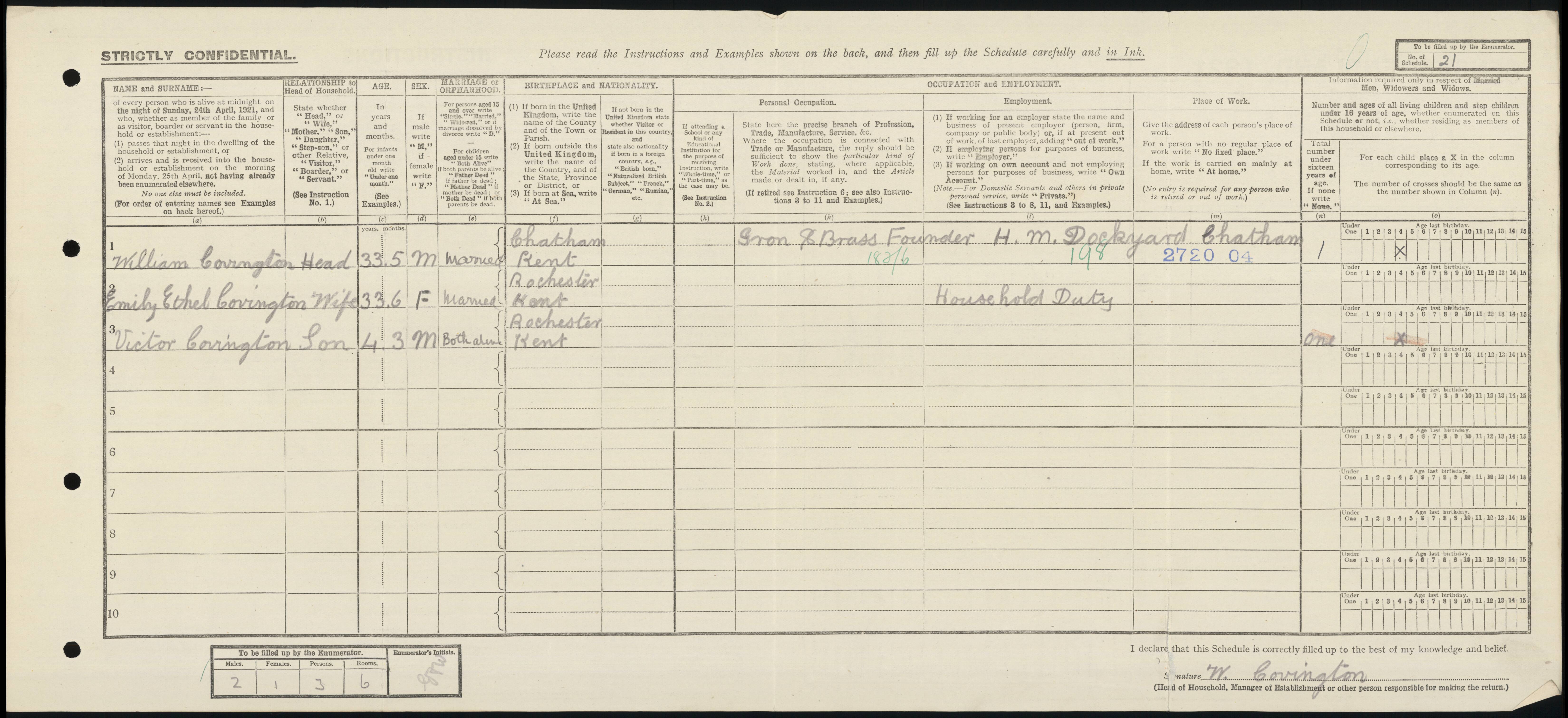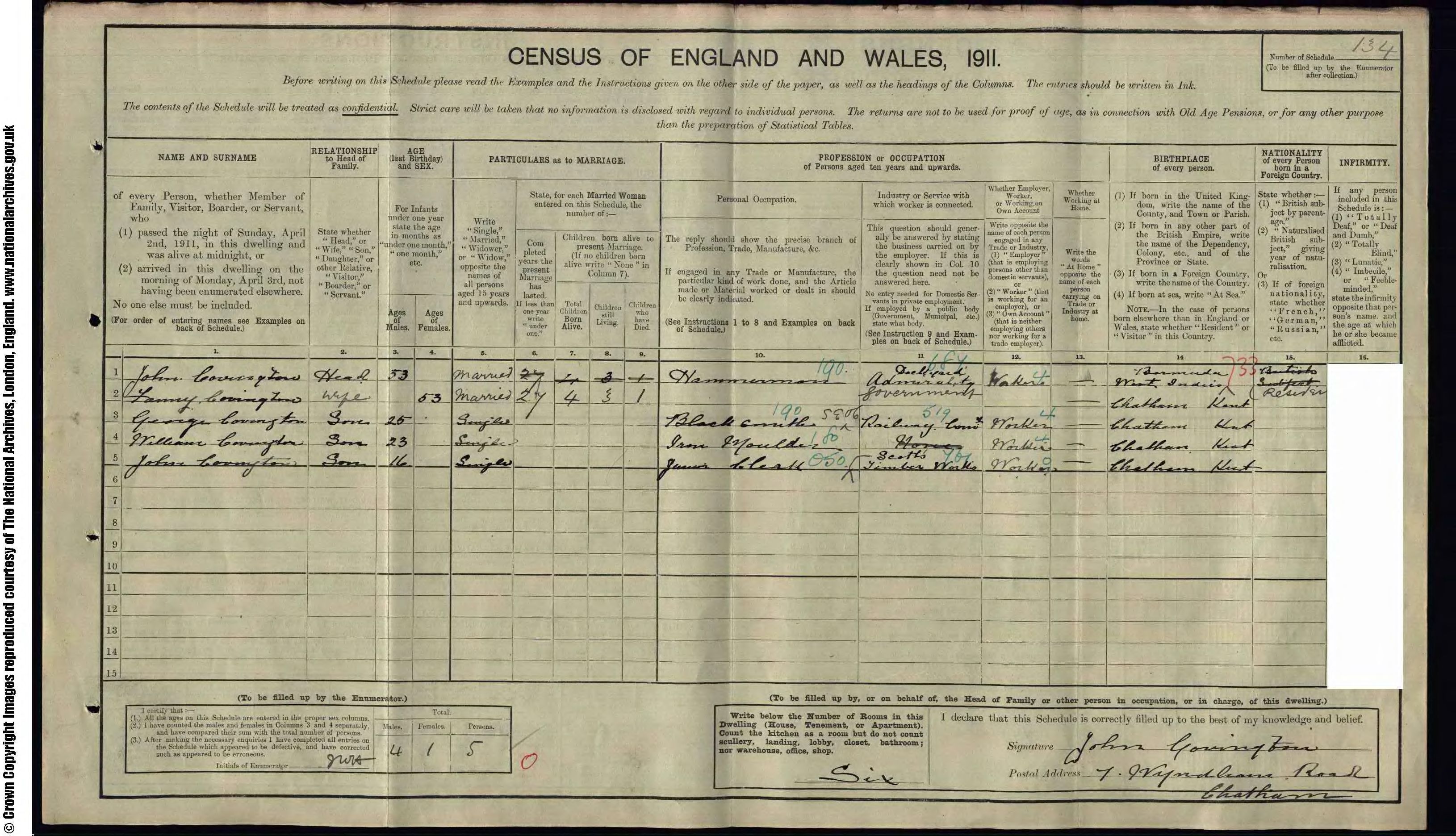 • Occupation: Iron and Brass Founder, 1921, Chatham, Kent, England. HM Dockyards