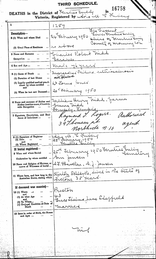 Cause of his death was Myocardial Failure, arteriosclerosis.9 Another name for Charles was Charles Temple Nidd.13 Baptism Notes: First name(s) Death Notes: First name(s) Events Occupation: farmer: Victoria, Australia. 7 14