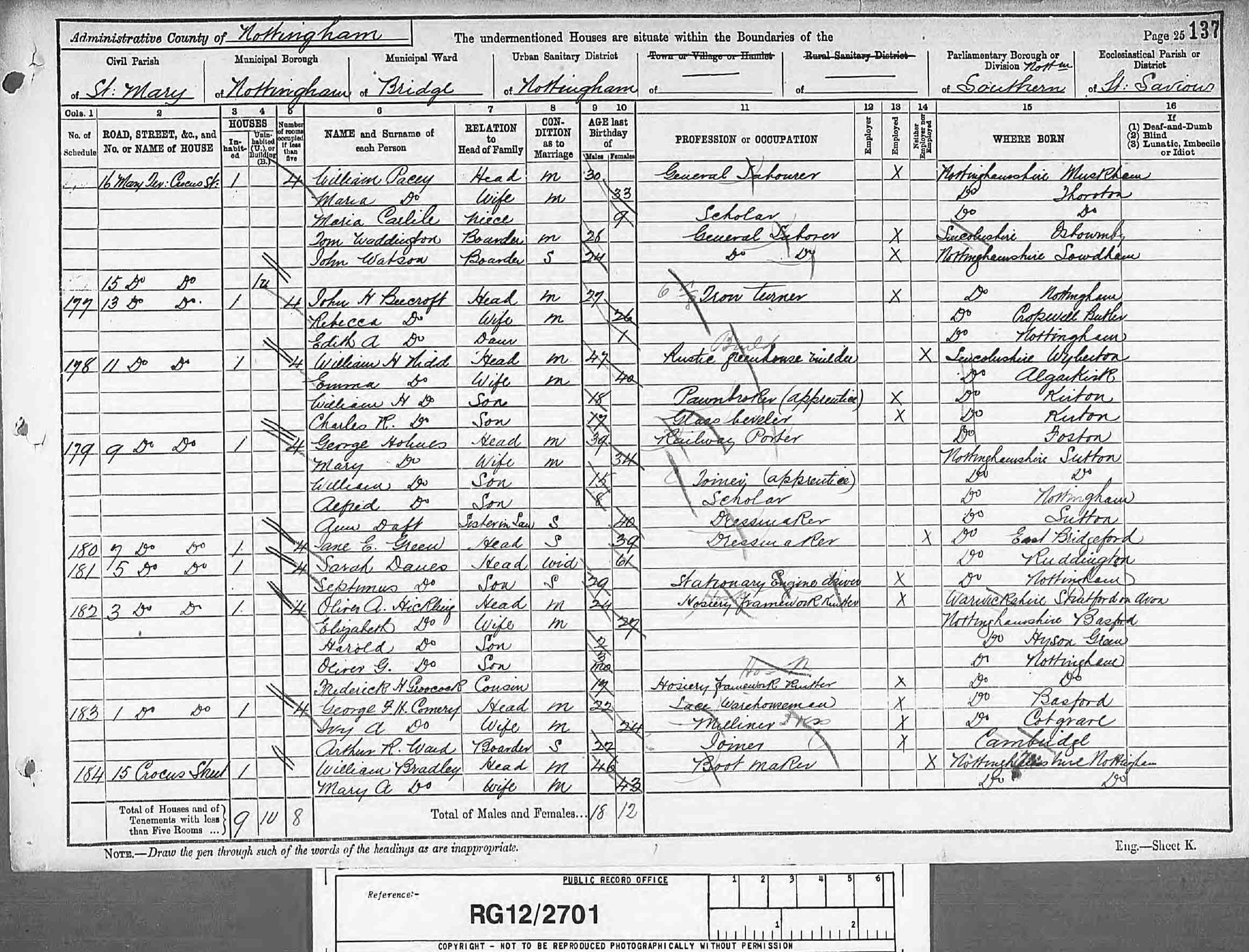 Lived at: 11 Mary Terrace, Crocus Street, 1891, Nottingham, Nottingham, England. 3 Occupation: Glass Beveller, 1891, Nottingham, Nottingham, England. 3 4 6 14 16 17 16 Mary Terrace, Crocus Street