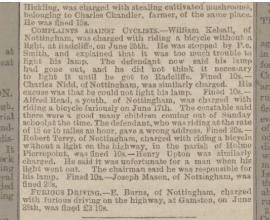 Court: fined for riding bike without lights, 1894, Nottingham, Nottingham, England.