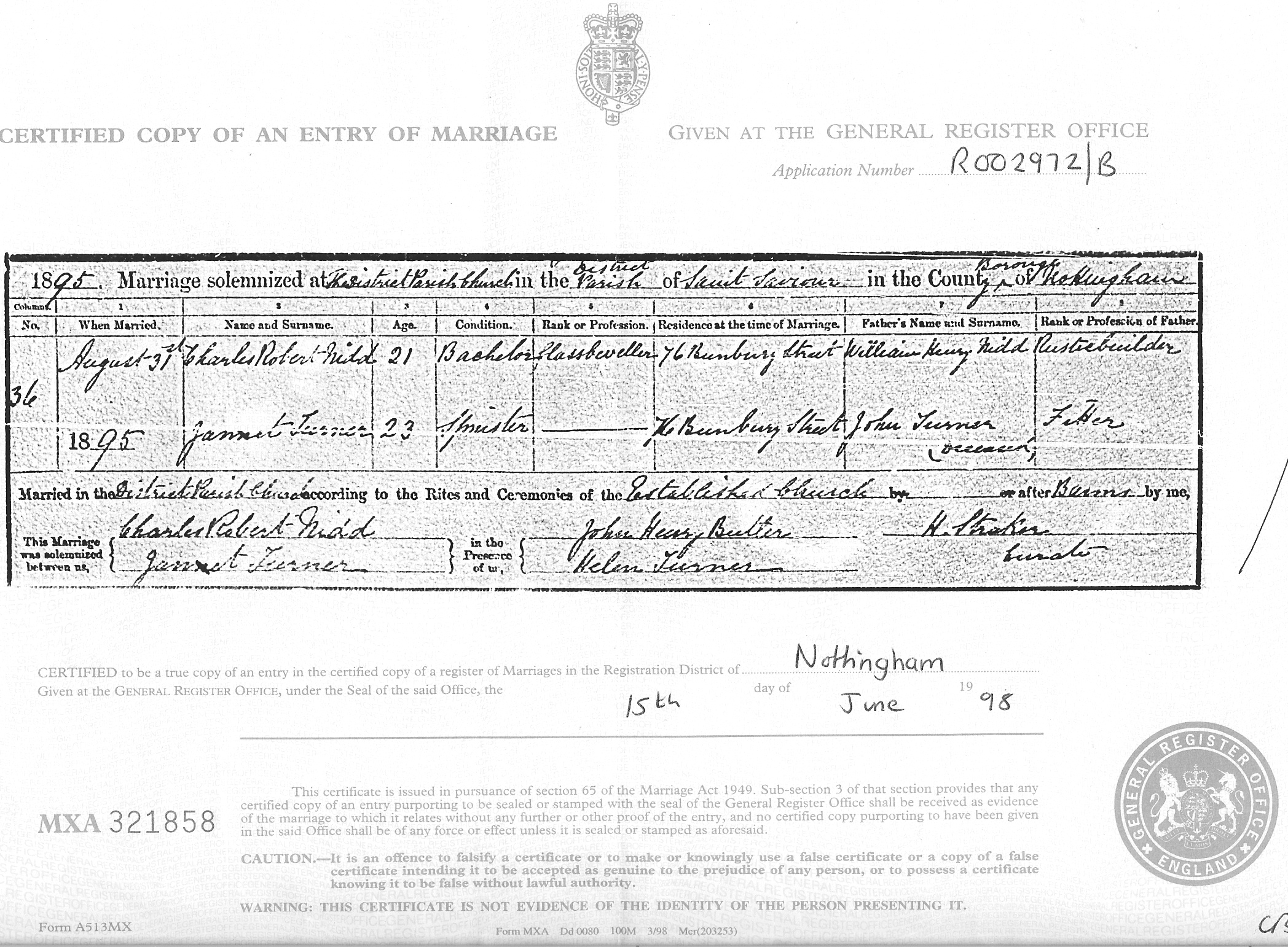 England and Wales, marriage certificate for Charles Robert Nidd and Jannet Turner, married August 31; citing 7b/497/36, September quarter 1895, Nottingham registration district, District Parish Church of St. Saviour sub-district; General Register Office, Southport. Cit. Date: Jun 1998. Cit. ID: MXA 321858, Surety: 4; 1895