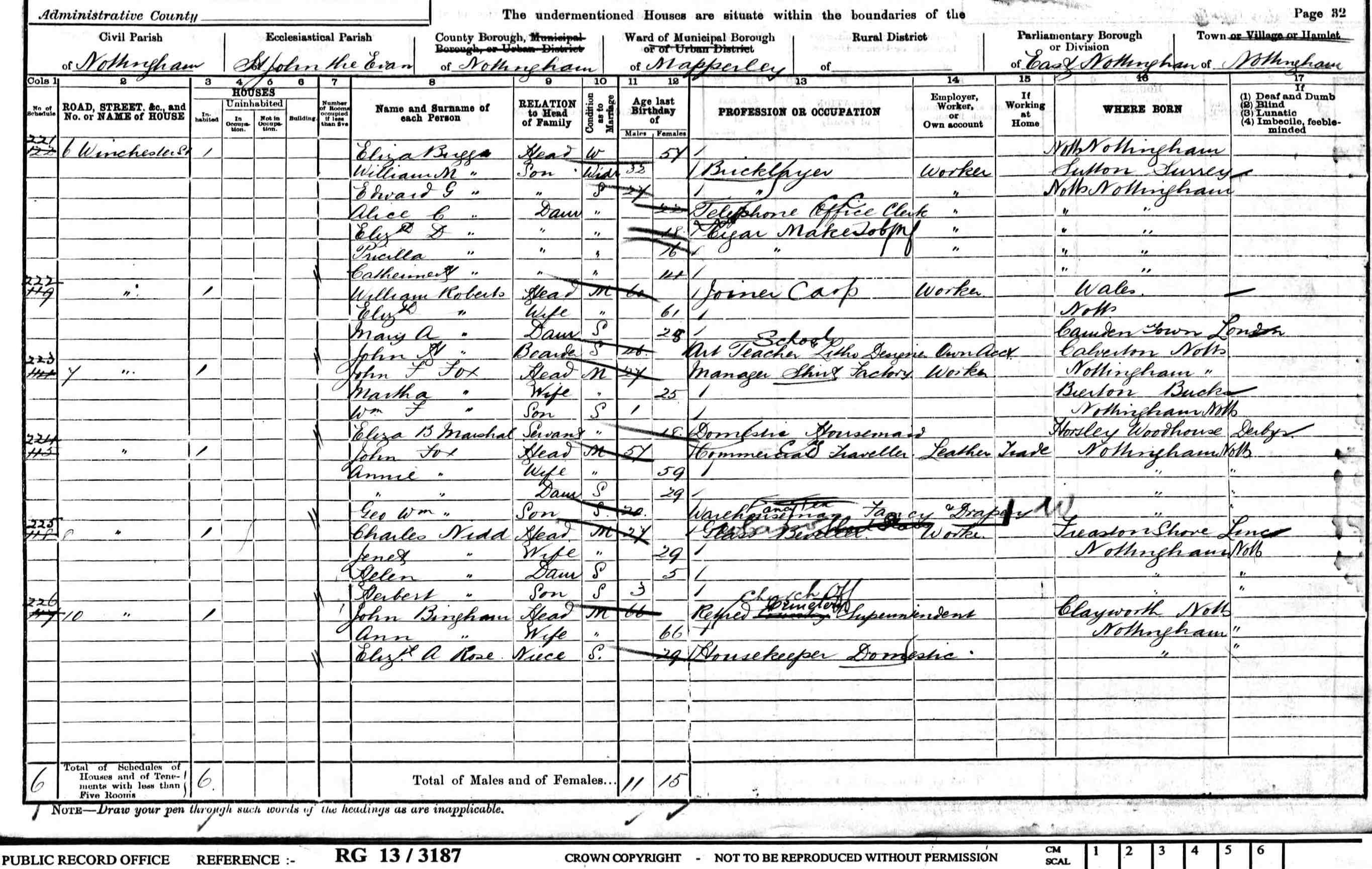 4 1901 census of England, Nottinghamshire, St. John the Evan, Nottingham, page 32, Charles Robert Nidd and family; digital images, Ancestry, Ancestry (www.ancestry.co.uk : accessed 2004); citing PRO RG 13/3187. Cit. Date: 23 Jan 2009. Surety: 4.