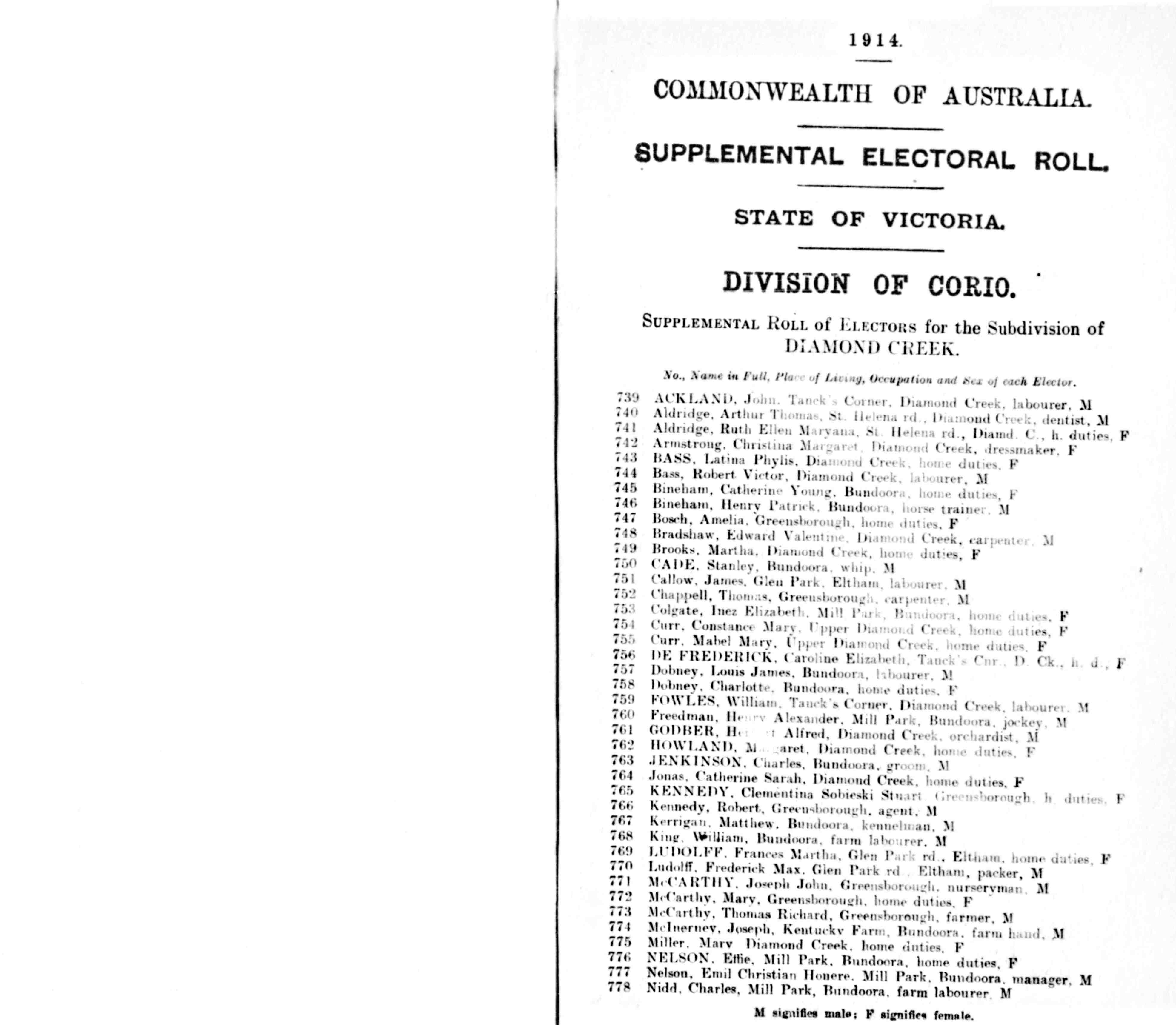 20 (Electoral Roll(Victoria /Ancestry.co.uk) , copies of original records via web page), Supplemental Roll of Electors for the Subdivision of Diamond Creek, , Districk Corio, Victoria. Surety: 4.