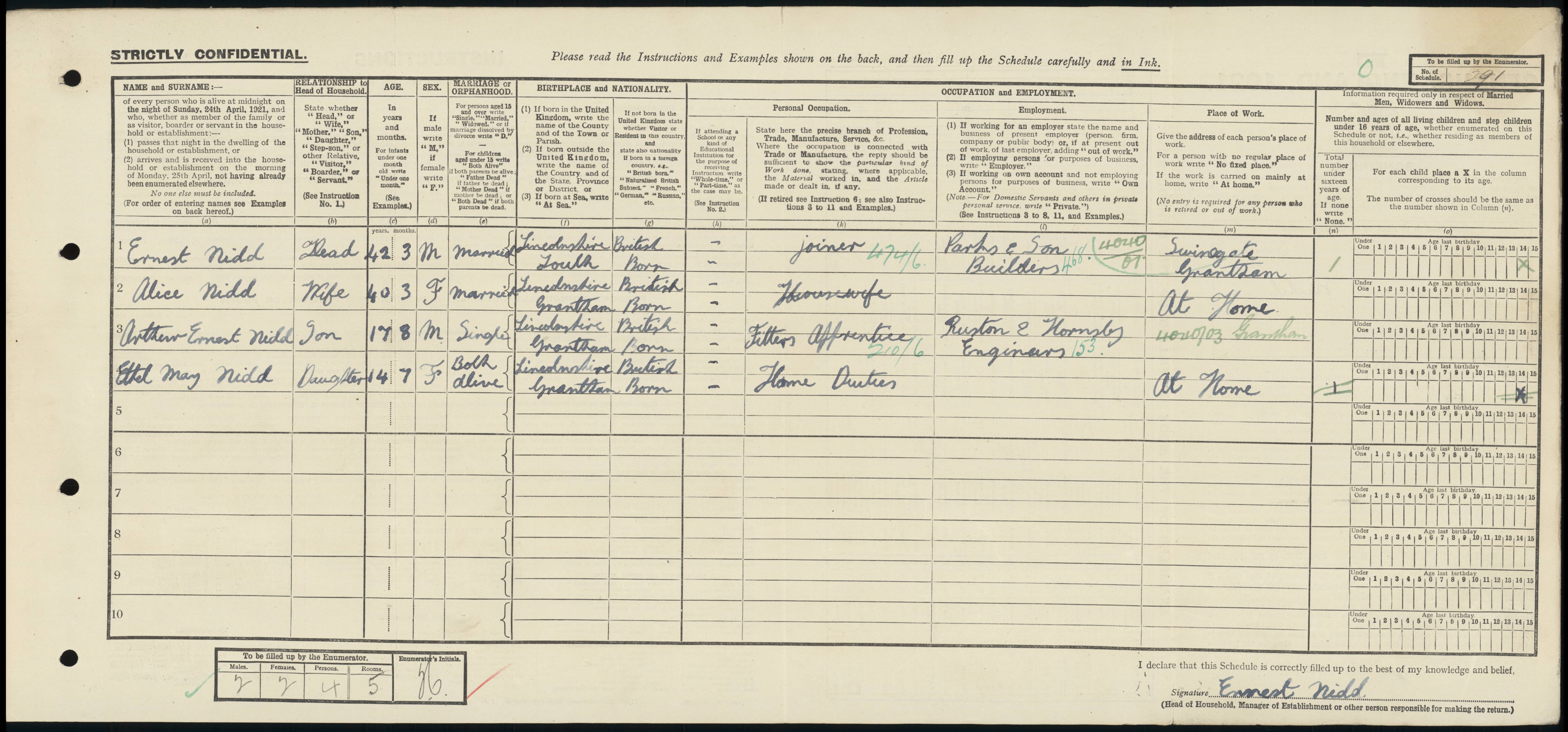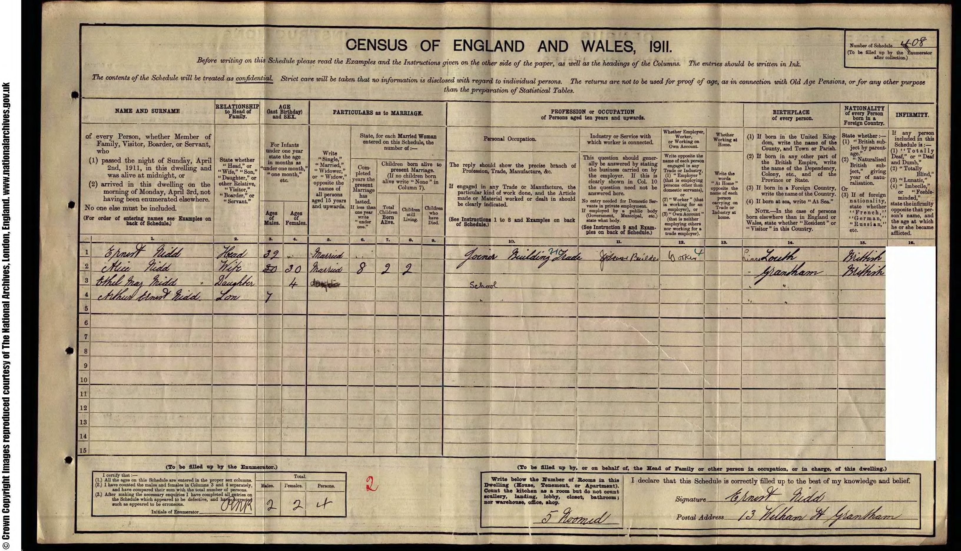 • Occupation: Joiner - Building Trade, 1911, Grantham, Lincolnshire, England. • Lived at, 1921, Grantham, Lincolnshire, England.