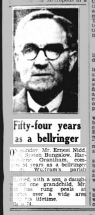 • Newspaper Article: 44 years a bell ringer, 1953, Grantham, Lincolnshire, England. • Occupation: Joiner, employed by Mssrs Parkes and Sons for 47 years and then 9 years with Brown and Webb: Swinegate, Grantham. Ernest married Alice Bottomley Sep Q 1903 in Grantham, Lincolnshire, England. (Alice Bottomley was born on 18 Mar 1881 in Grantham, Lincolnshire, England, died on 13 Nov 1963 and was buried on 18 Nov 1963 in Grantham, Lincolnshire, England.) |