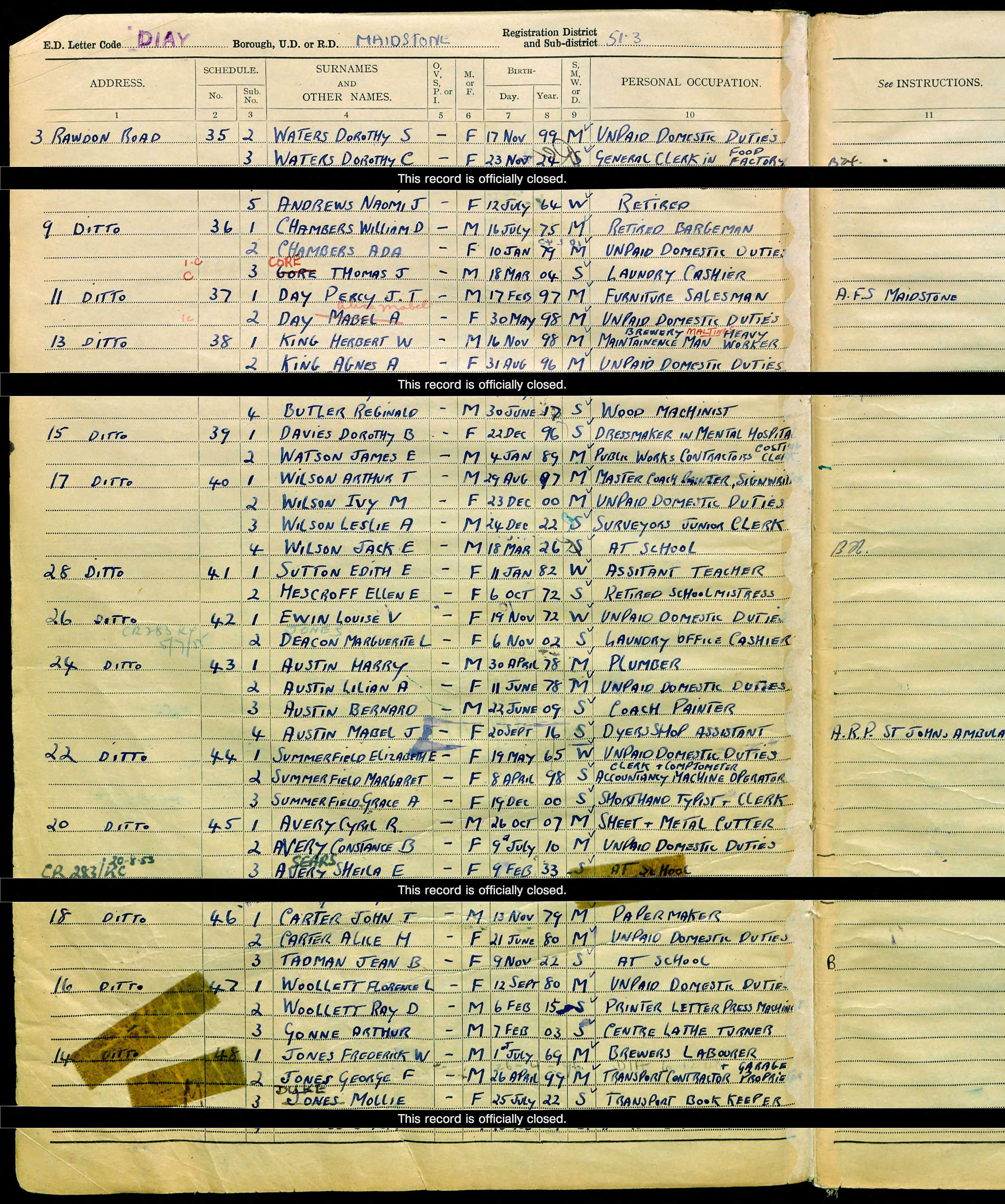 • Lived at: 11 Rawdon Road, 1939, Maidstone, Kent, England. Alice married Percy J.T. Day Sep Q 1927 in Maidstone, Kent, England. (Percy J.T. Day was born on 17 Feb 1897 and died Jun Q 1976 in Maidstone, Kent, England.) |