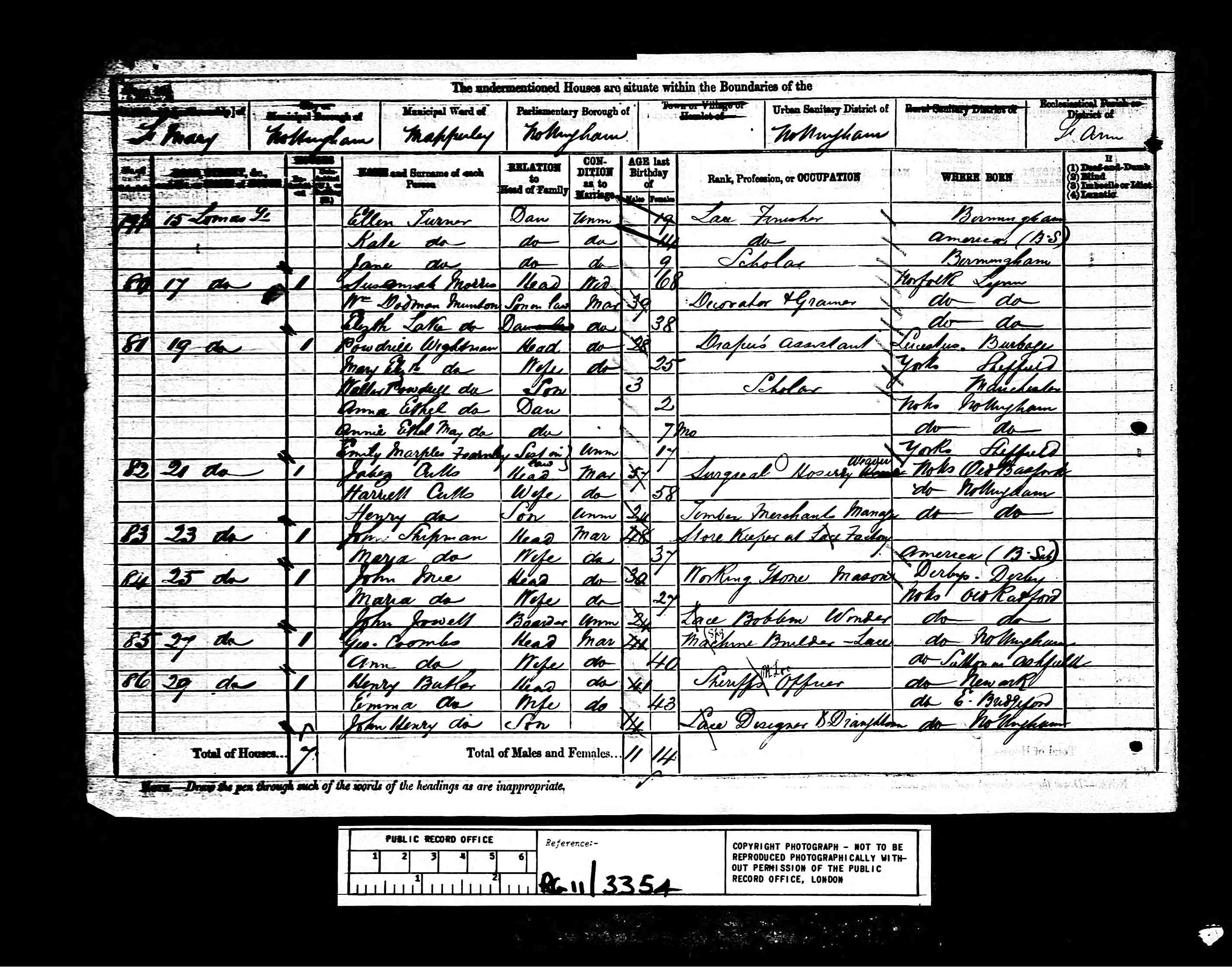 8 (1891 English and Welsh Census(London, TNA/Ancestry.co.uk, 1992) , Web site showing copies of original enumerator schedules) ID: CEN 1891 RG12, rg12 27011891 Nottingham, Nottinghamshire. Cit. Date: 22 Jun 2003. Cit. ID: CEN 1891 RG12 2701. Surety: 4.