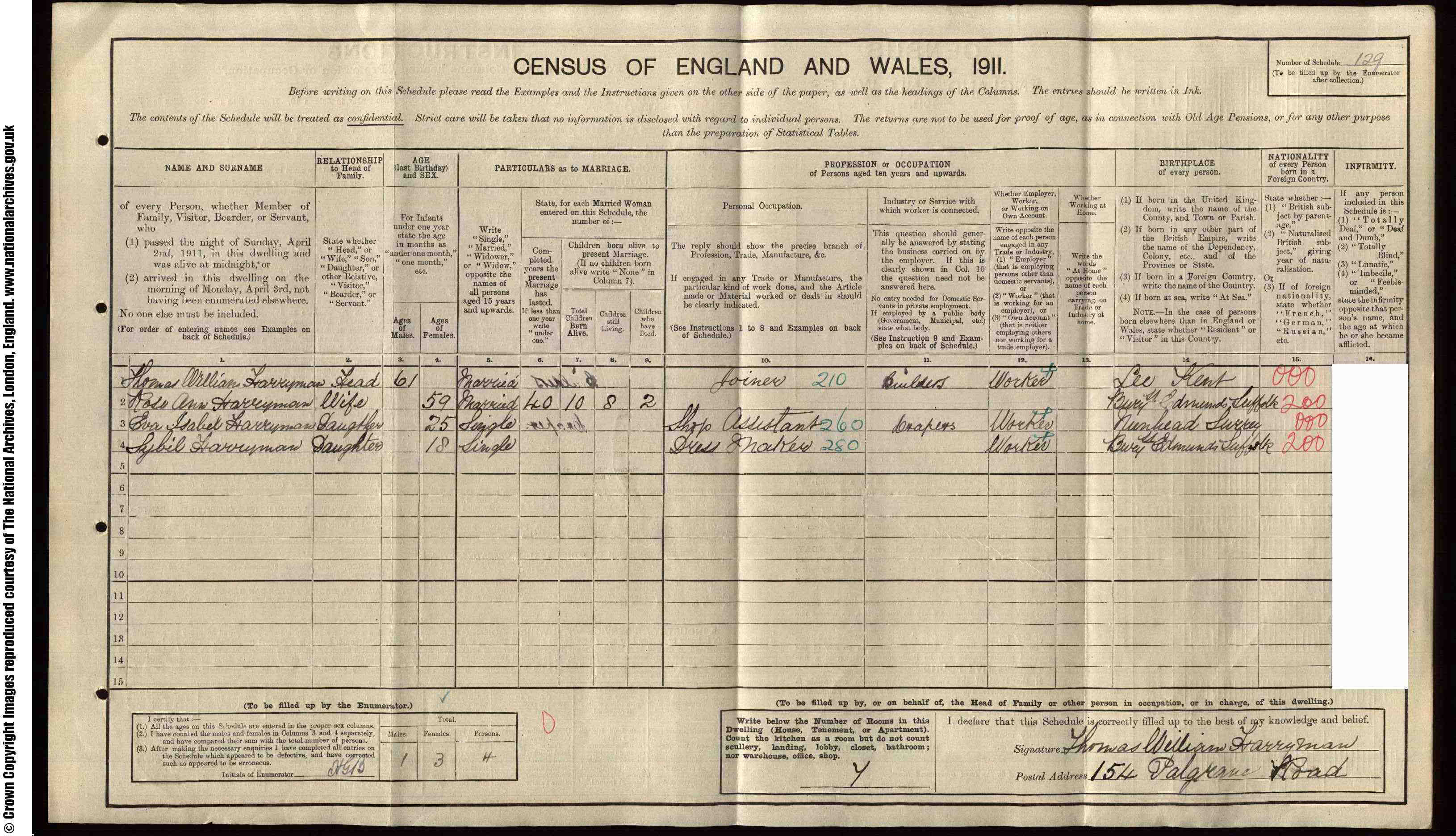 • Lived at: 154 Palgrave Road, 1911, Yarmouth, Nofolk. • Occupation: Dress Maker, 1911, Yarmouth, Nofolk.