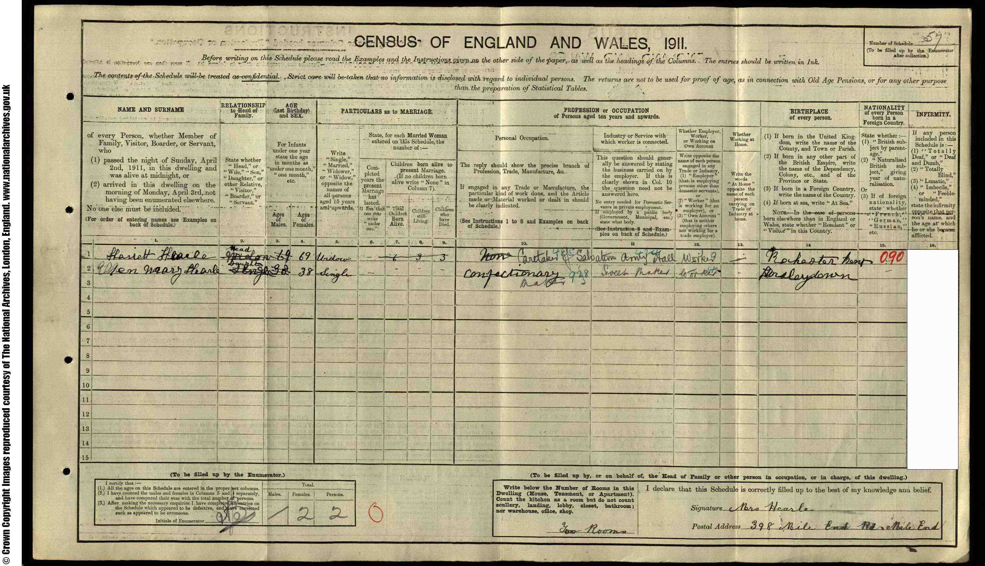 • Lived at: 398 Mile End Road, 1911, London. • Occupation: Caretaker Salvation Army Hall, 1911, Mile End. • Patient: Tootng Bee Mental Hospital Tooting Bee Common, 1921, Wandsworth Borough, London & Surrey, England. Harriet married Stephen Doble Hearle on 13 Feb 1867 in St. Thomas, Charlton. (Stephen Doble Hearle was born circa 1837 in Hammersmith, Middlesex, England and died between 1901 and 1911.) |