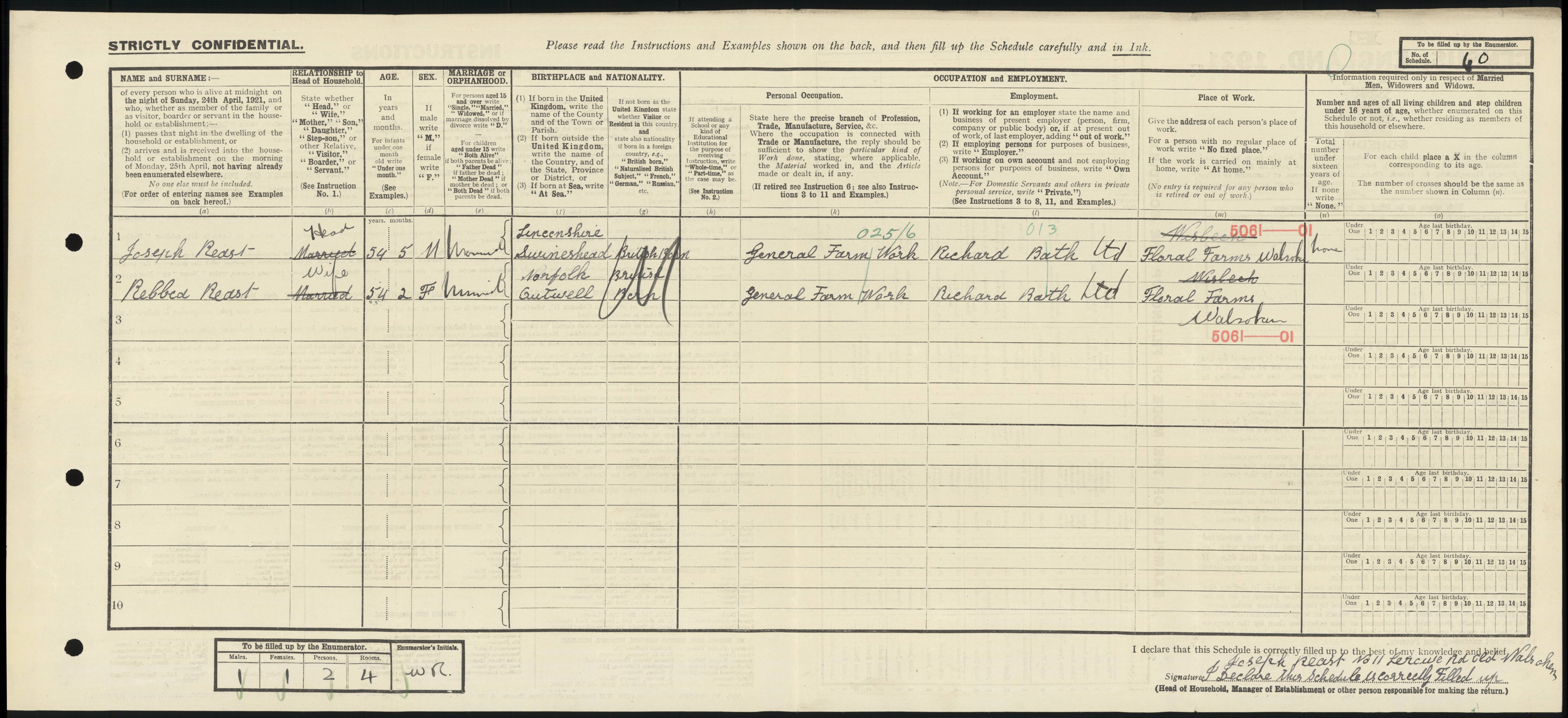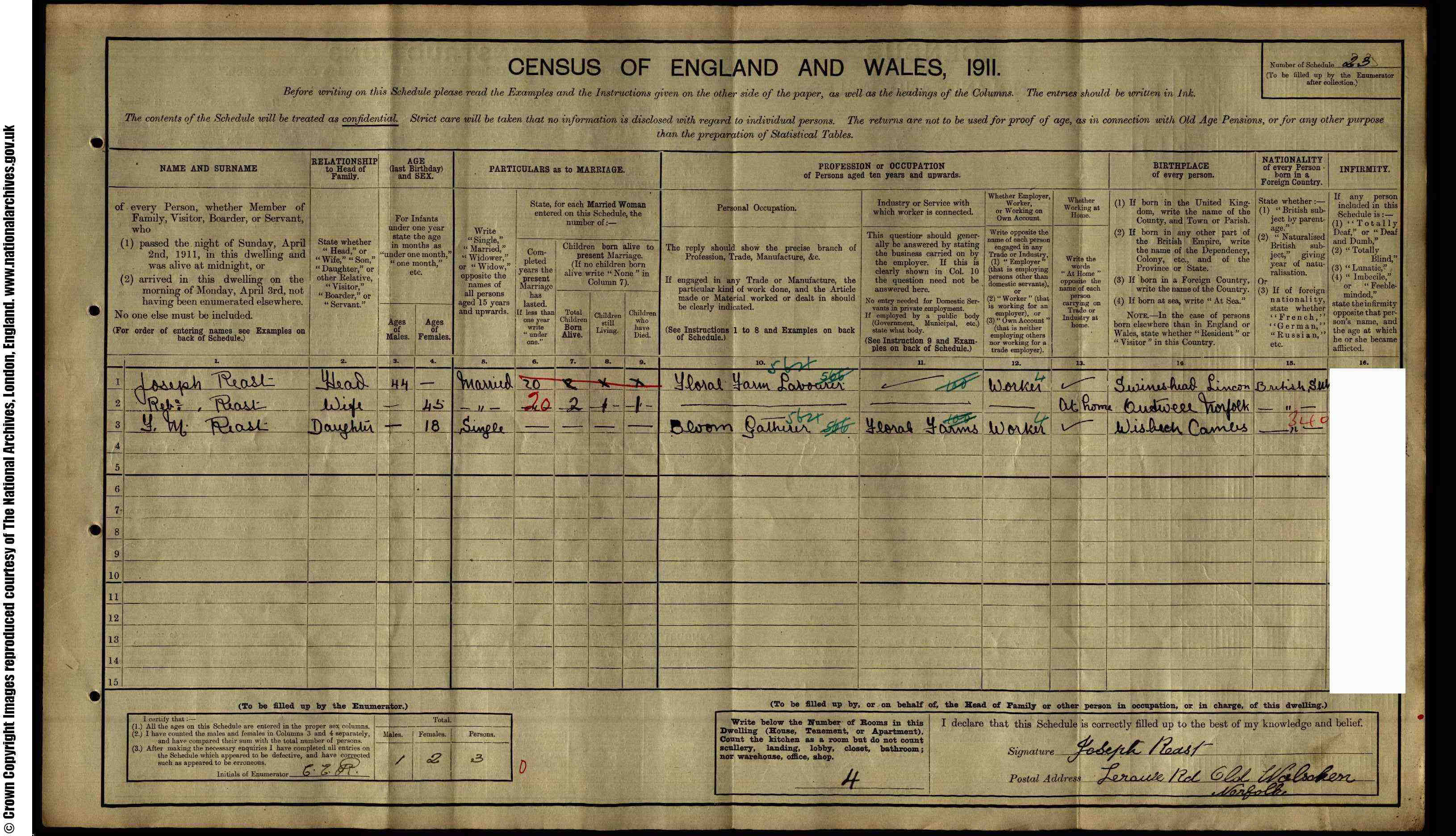 • Lived at: 11 Lerowe Road, Walsoken, 1921, Cambridgeshire. • Occupation: General Farm Work, 1921, Wisbech, Cambridgeshire.