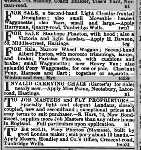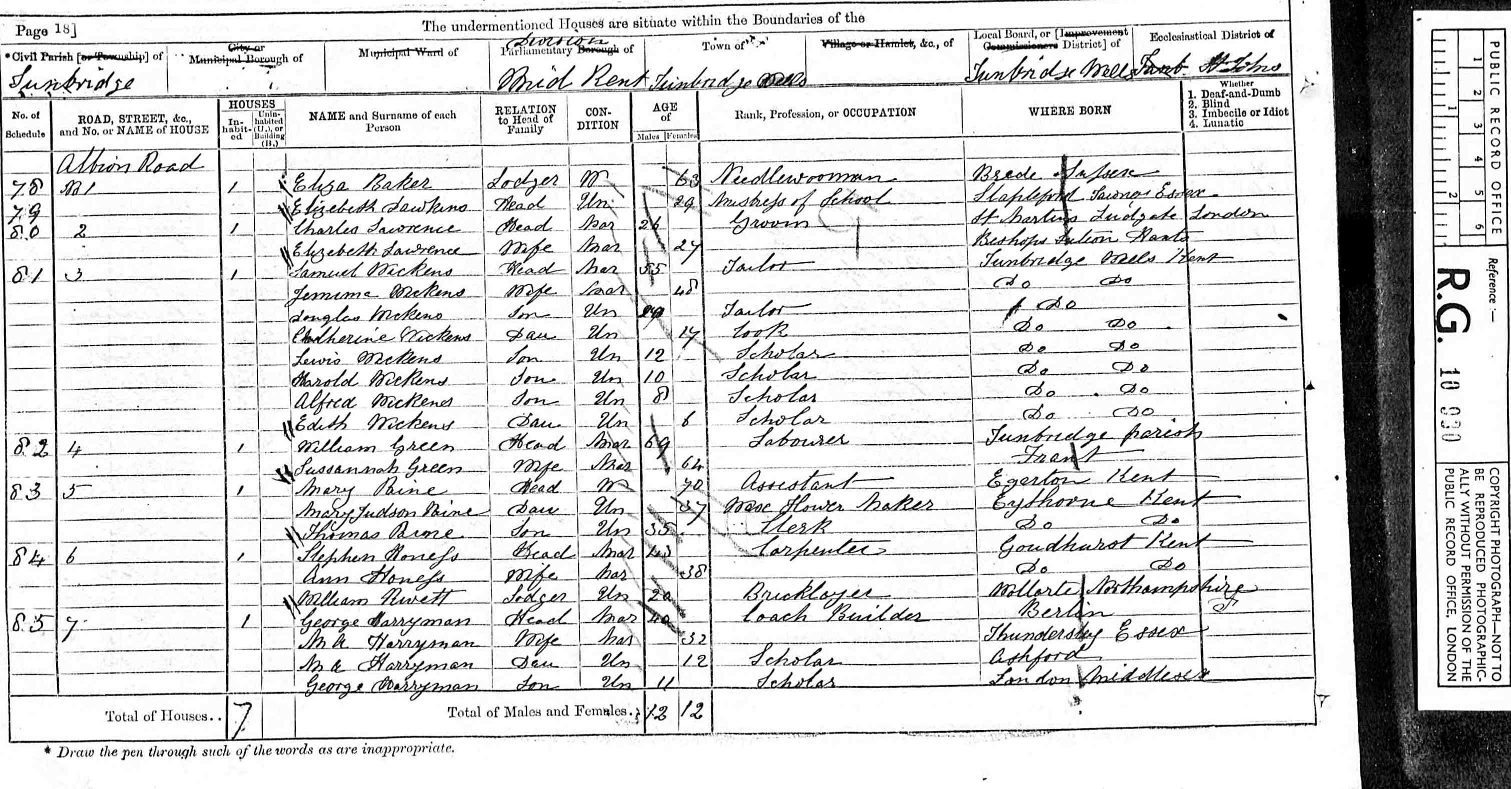 • Occupation: Carriage Builder, 1861, Battersea, Surrey, England. 2 • Lived at: 7 Albion Road, 1871, Tunbridge Wells, Kent, England. 5