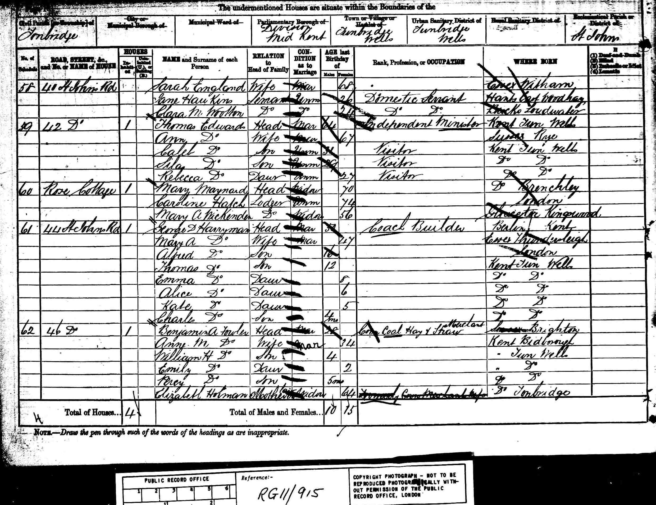 • Occupation: Coach Builder, 1871, Tunbridge Wells, Kent, England. 5 • Lived at: 44 St. Johns Road, 1881, Tunbridge Wells, Kent, England. 6