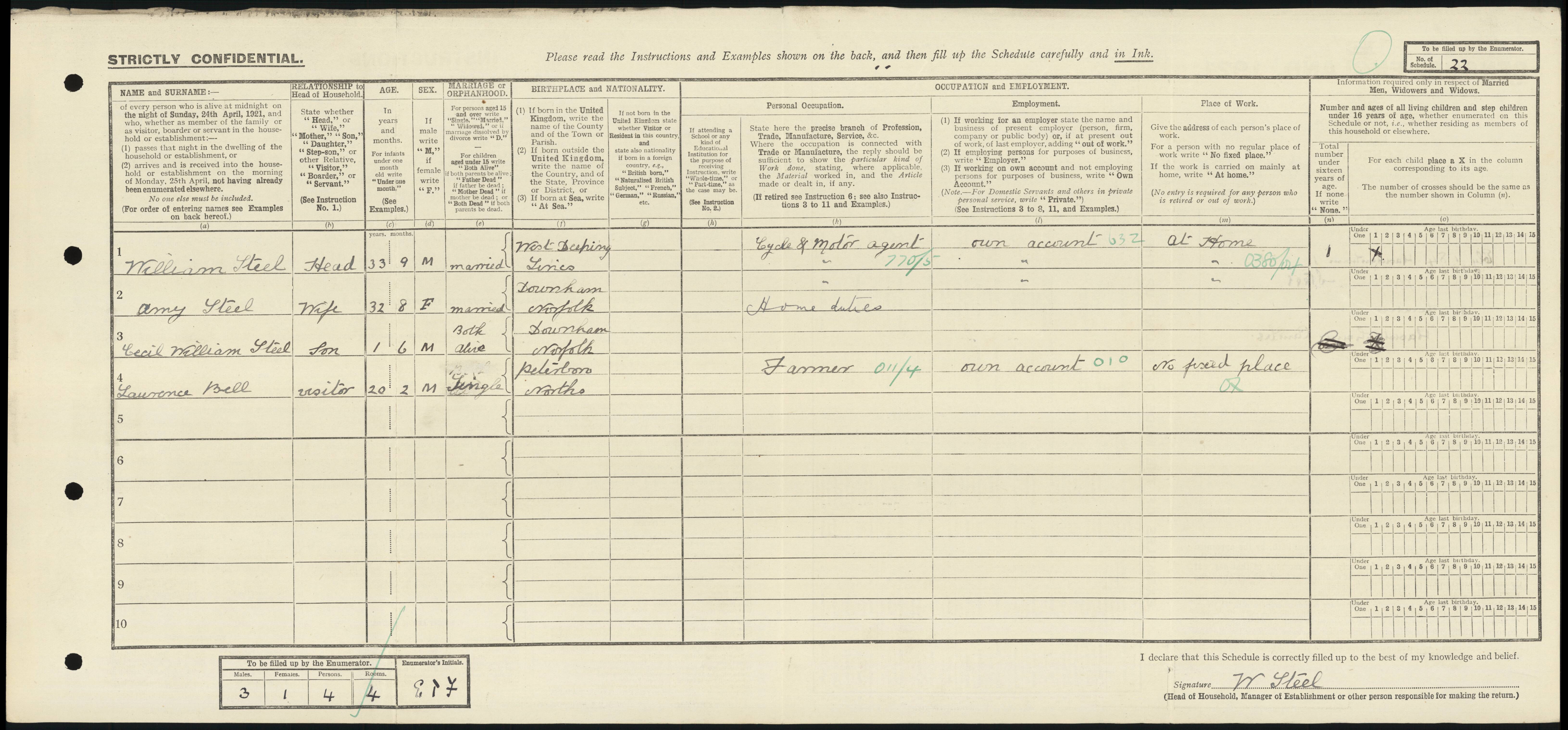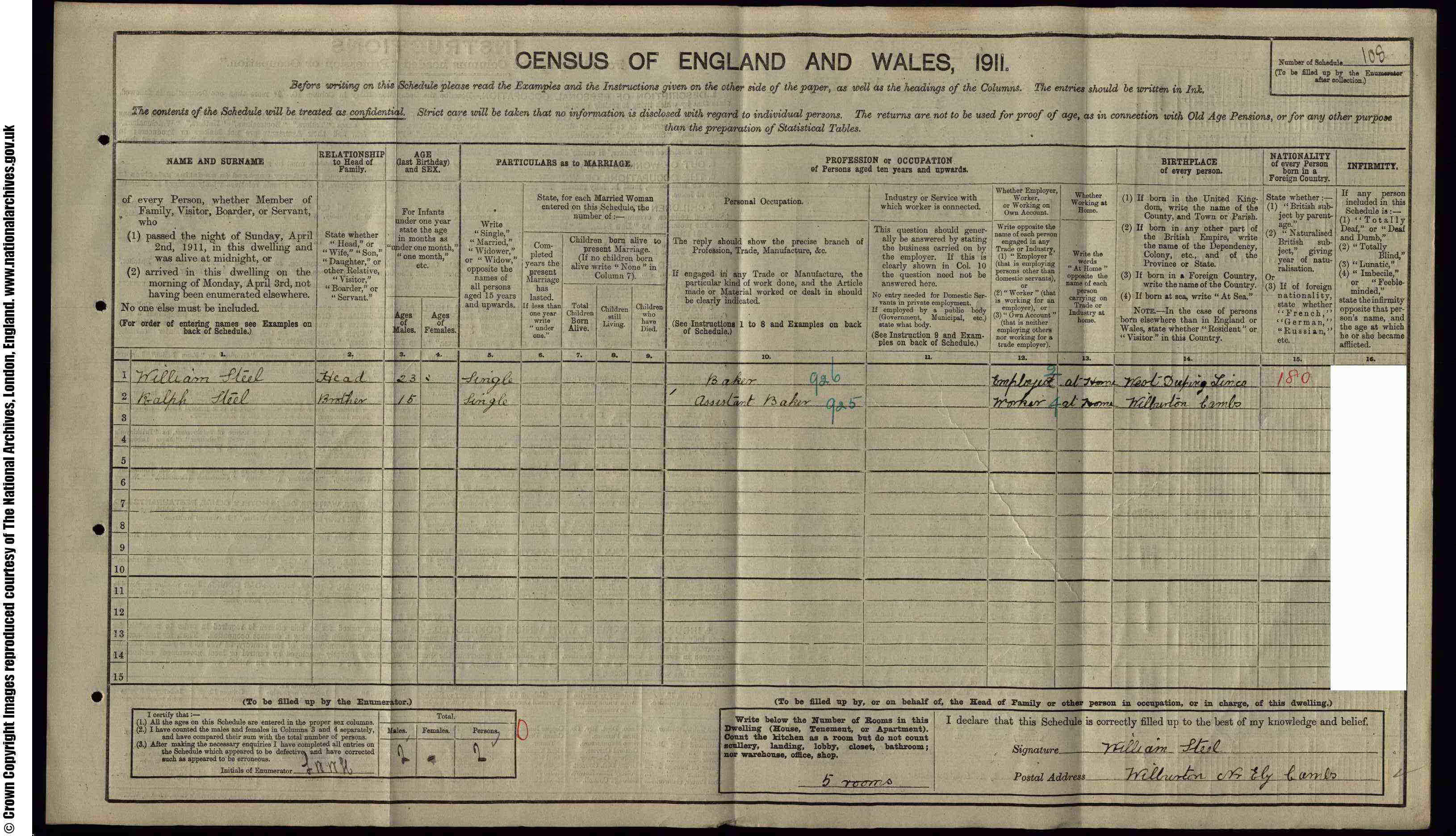 Other names for William were Clement W Steel 2 and Willie Steel. Events • Lived at: Unicorn Bakery, 1891, Wilburton, Cambridgeshire. 2