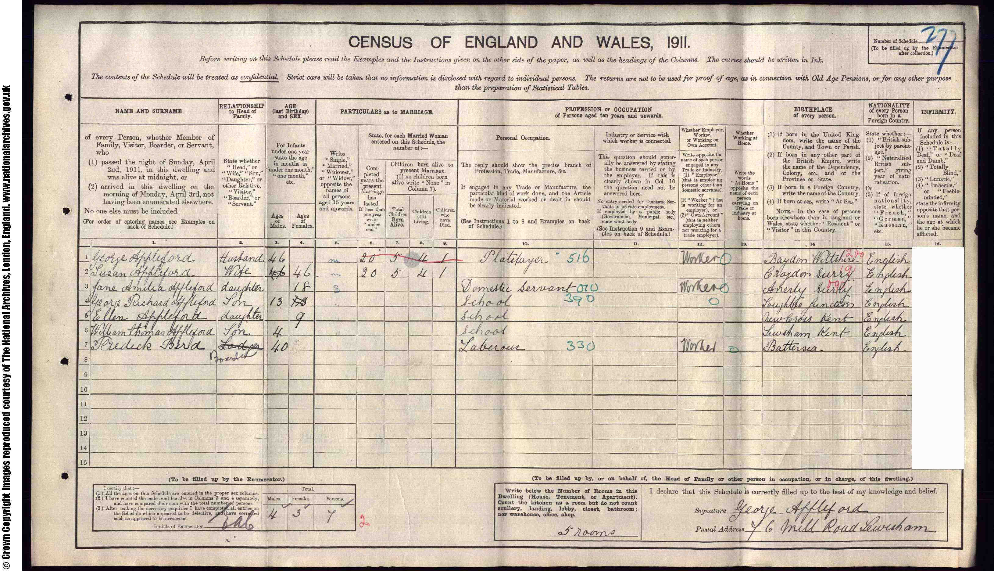• Lived at: 76 Mill Road, 1911, Lewisham, Kent, England.