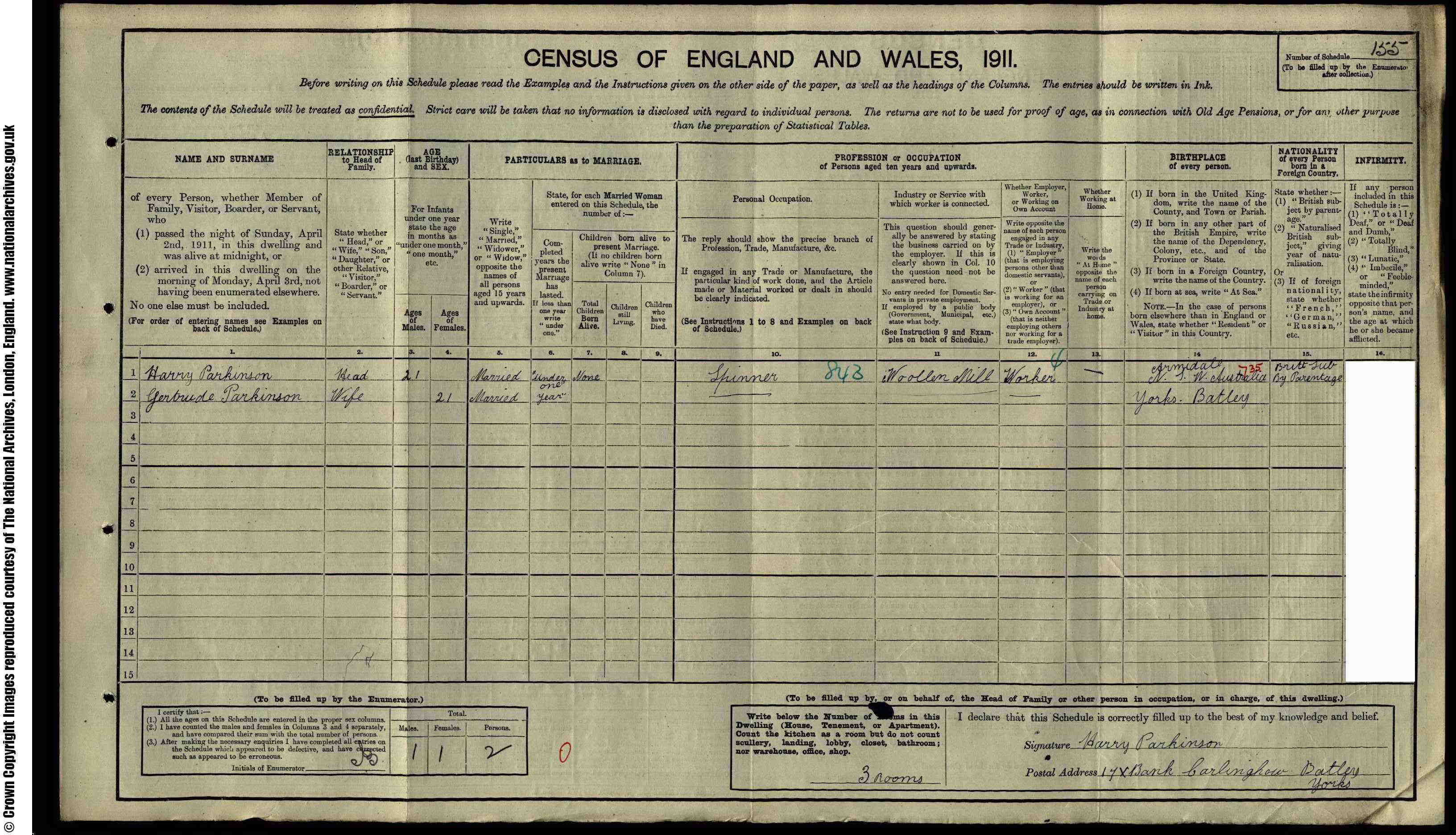 Another name for Harry was Harrie Parkinson. Events • Lived at: 4 yard 1 Wellington, 1901, Batley, Yorkshire, England. 3