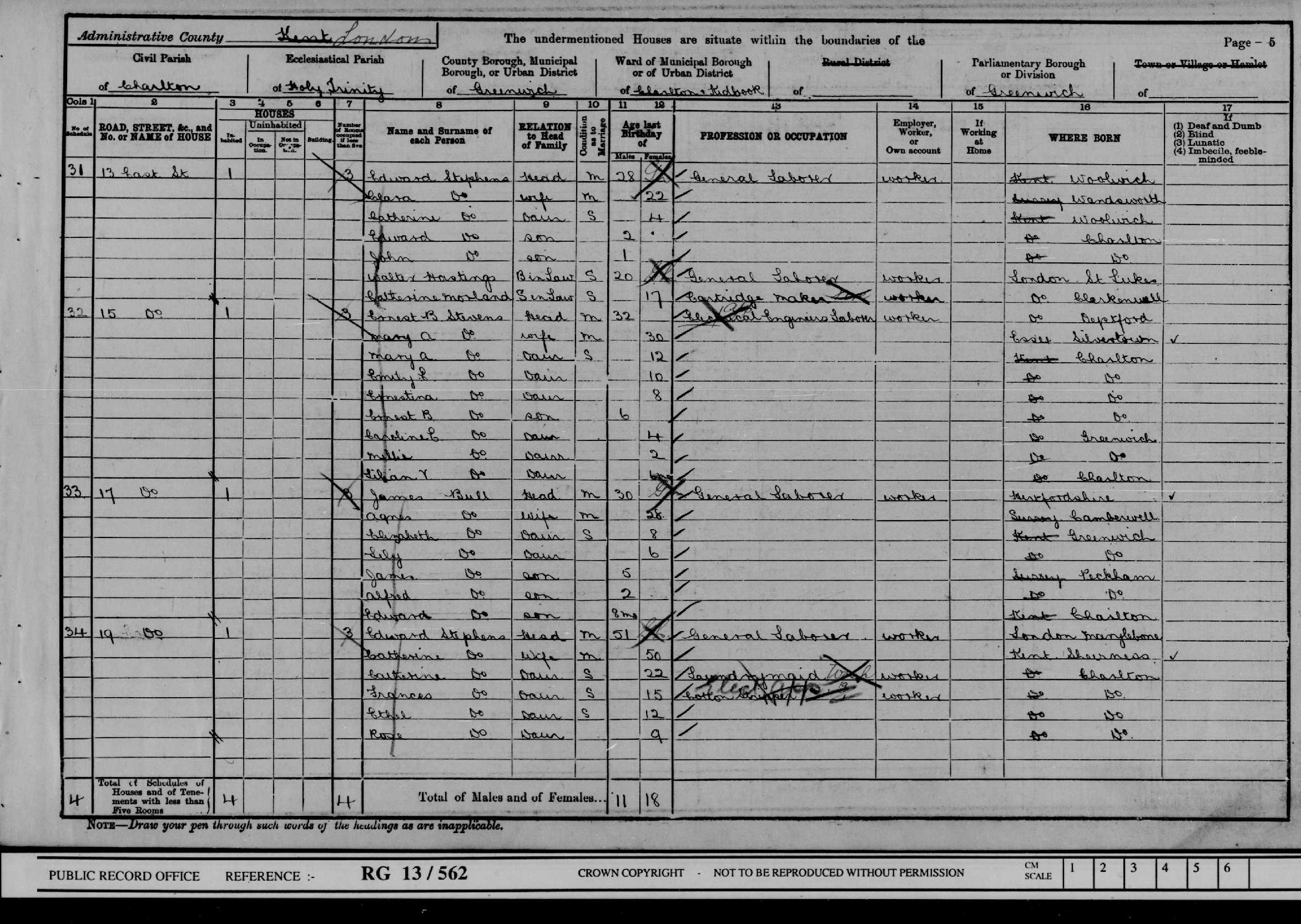 • Lived at: 5 Claremont Street, 1881, Greenwich, Kent, England. 1 • Lived at: 5 Claremont Street, 1881, Greenwich, Kent, England. 1 • Occupation: General Labourer, 1891, Charlton, Kent, England. 2 5