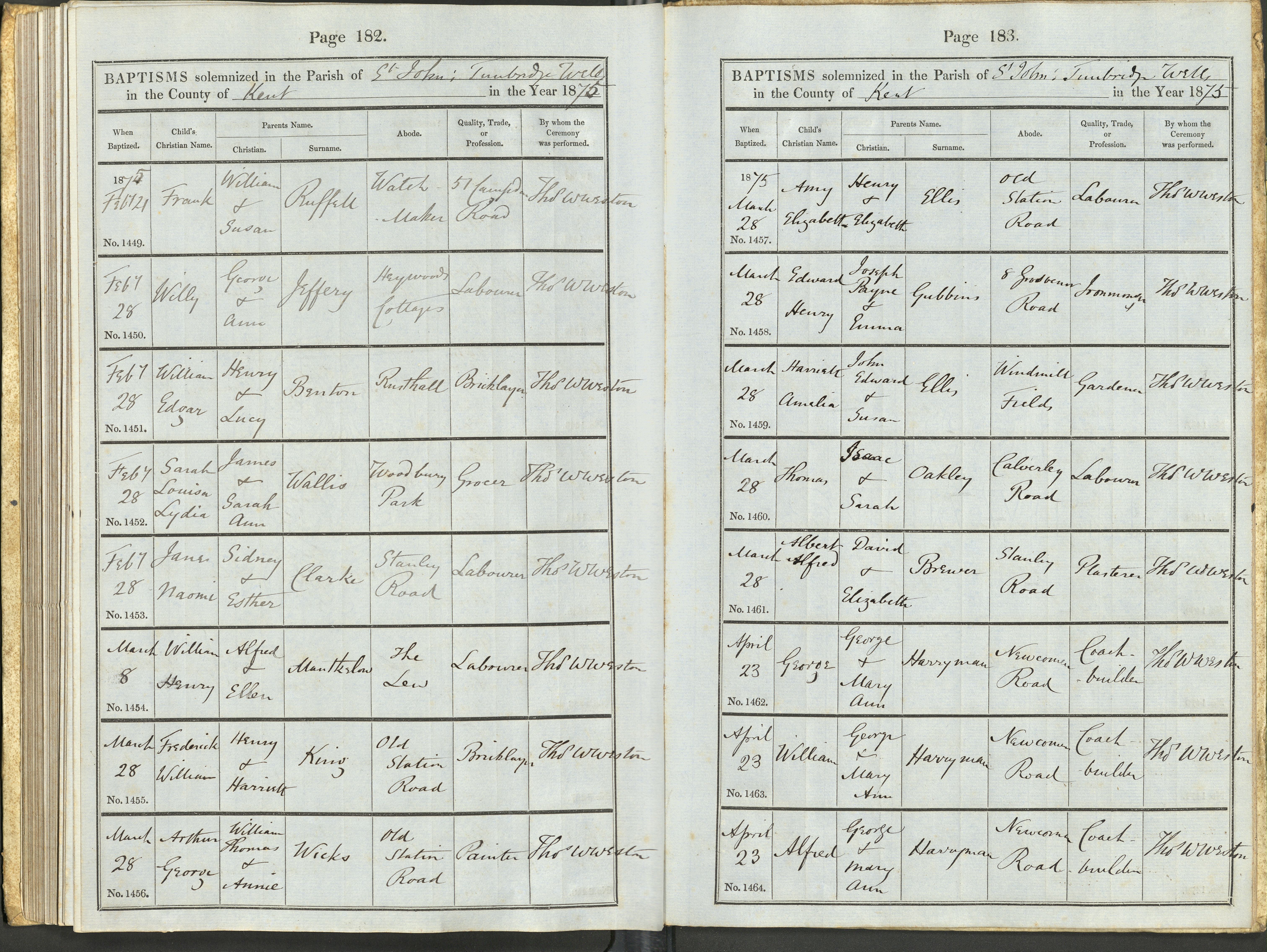 • Baptism, 23 Apr 1875, Tunbridge, Kent, England. • Lived at: Sion House Cottage, 1881, Tunbridge Wells, Kent, England. 4 • Occupation: Coach Builder Wheeler, 1881, Tunbridge Wells, Kent, England. 4 |