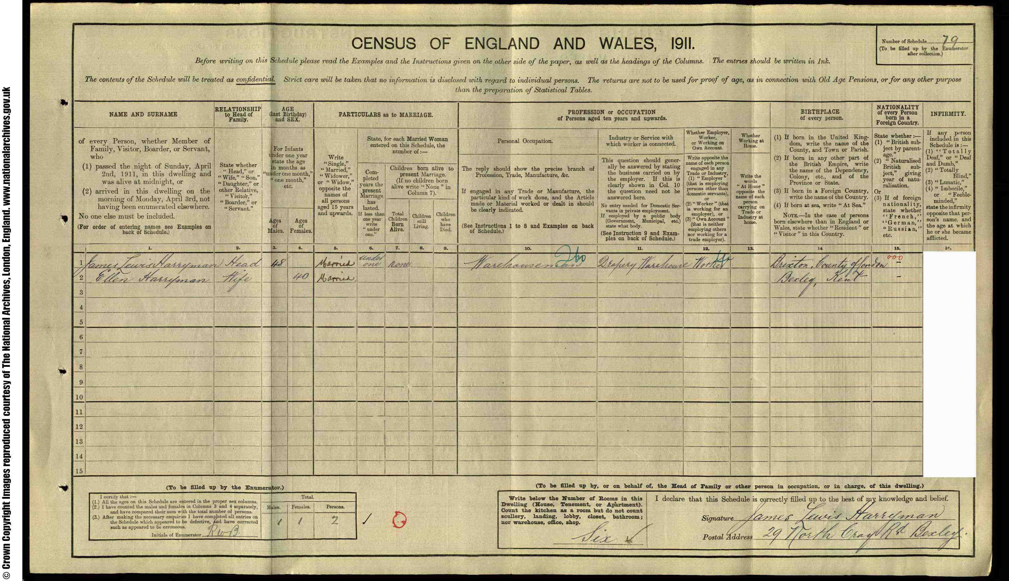 • Lived at: 29 North Cray Road, 1911, Bexley, Kent, England. • Occupation: Warehouseman Drapery Warehouse, 1911, Bexley, Kent, England. • Occupation: Warehouse man, 1921, Kent. boarding • Lived at: 34 Cray Cottage, 1930, Bexley, Kent, England. James married Ellen Weller on 15 Aug 1910 in Bexley, Kent, England. (Ellen Weller was born circa 1871 in Bexley, Kent, England and died between 1911 and 1921.) |