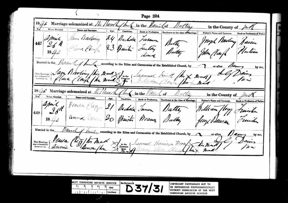 Death Notes: Name: Events • Lived at: Moor End Road, 1871, Dewsbury, Yorkshire & Yorkshire (West Riding), England. 4 • Lived at: Staincliffe Road, 1871-1881, Dewsbury, Yorkshire & Yorkshire (West Riding), England. 5 • Occupation: Milk Boy, 1881, Dewsbury, Yorkshire & Yorkshire (West Riding), England. 6 • Lived at: 1 Staincliffe Hall Road, 1891, Batley, Yorkshire, England. 2 • Occupation: Tanner's Man, 1891, Batley, Yorkshire, England. 2 • Occupation: Baker's Van Man, 1901, Batley, Yorkshire, England. 3 • Lived at: 39 Dewsbury Gate Road, 1911, Batley, Yorkshire, England. • Occupation: Gas Works Labourer, 1911, Batley, Yorkshire, England. Sam married Clara Clough on 26 Apr 1890 in Dewsbury, Yorkshire & Yorkshire (West Riding), England. (Clara Clough was born circa 1858 in Heckmondwike, Yorkshire, England 2 and died between 1891 and 1895 2 3.) Sam next married Margaret Robinson on 3 Jun 1895 in Dewsbury, Yorkshire & Yorkshire (West Riding), England. (Margaret Robinson was born circa 1870 in Batley Carr, Yorkshire, England, 3 and died after 1911 3.) |