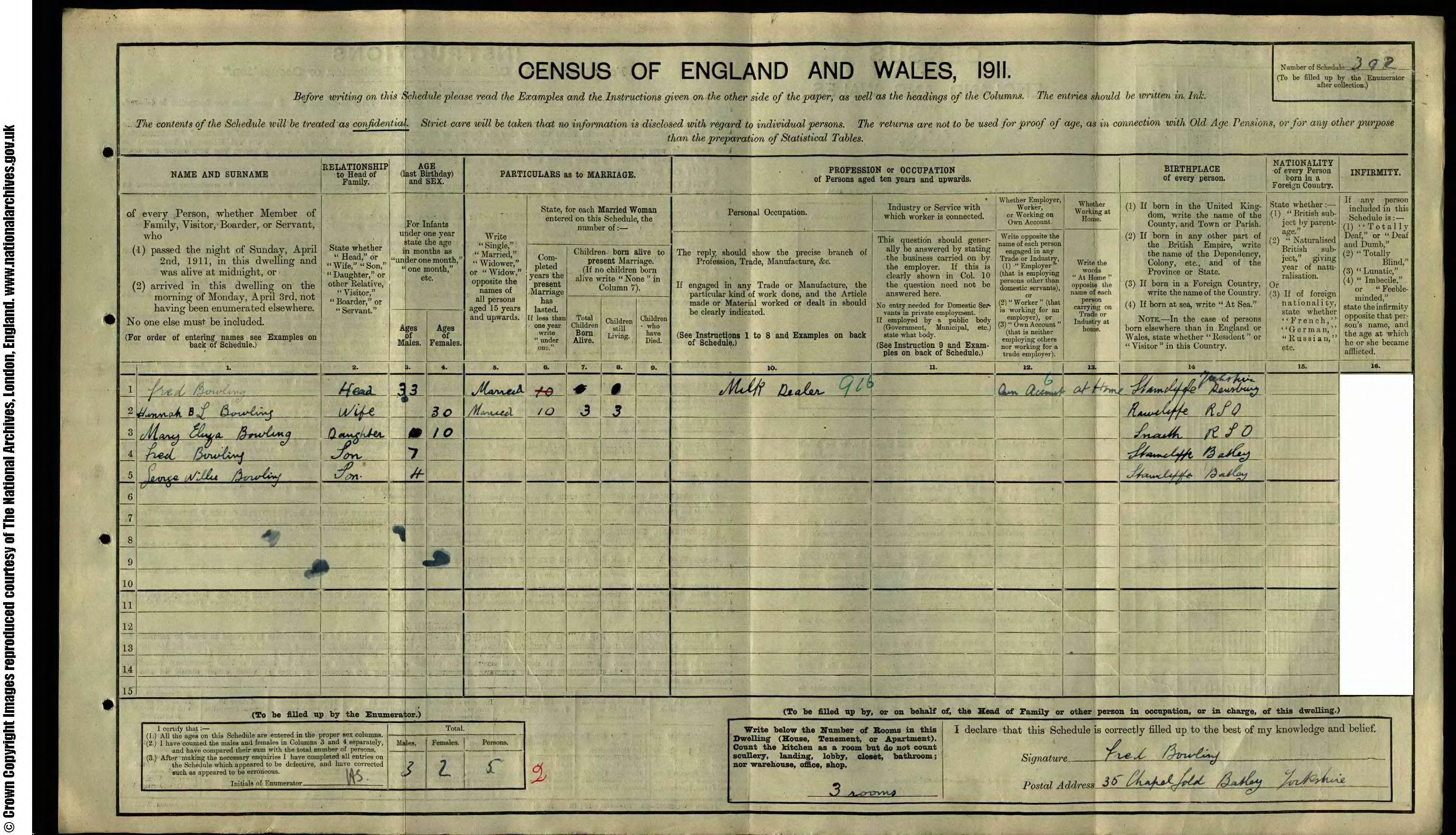 • Lived at: 35 Chapelford, 1911, Batley, Yorkshire, England. • Occupation: Milk Dealer, 1911, Batley, Yorkshire, England.