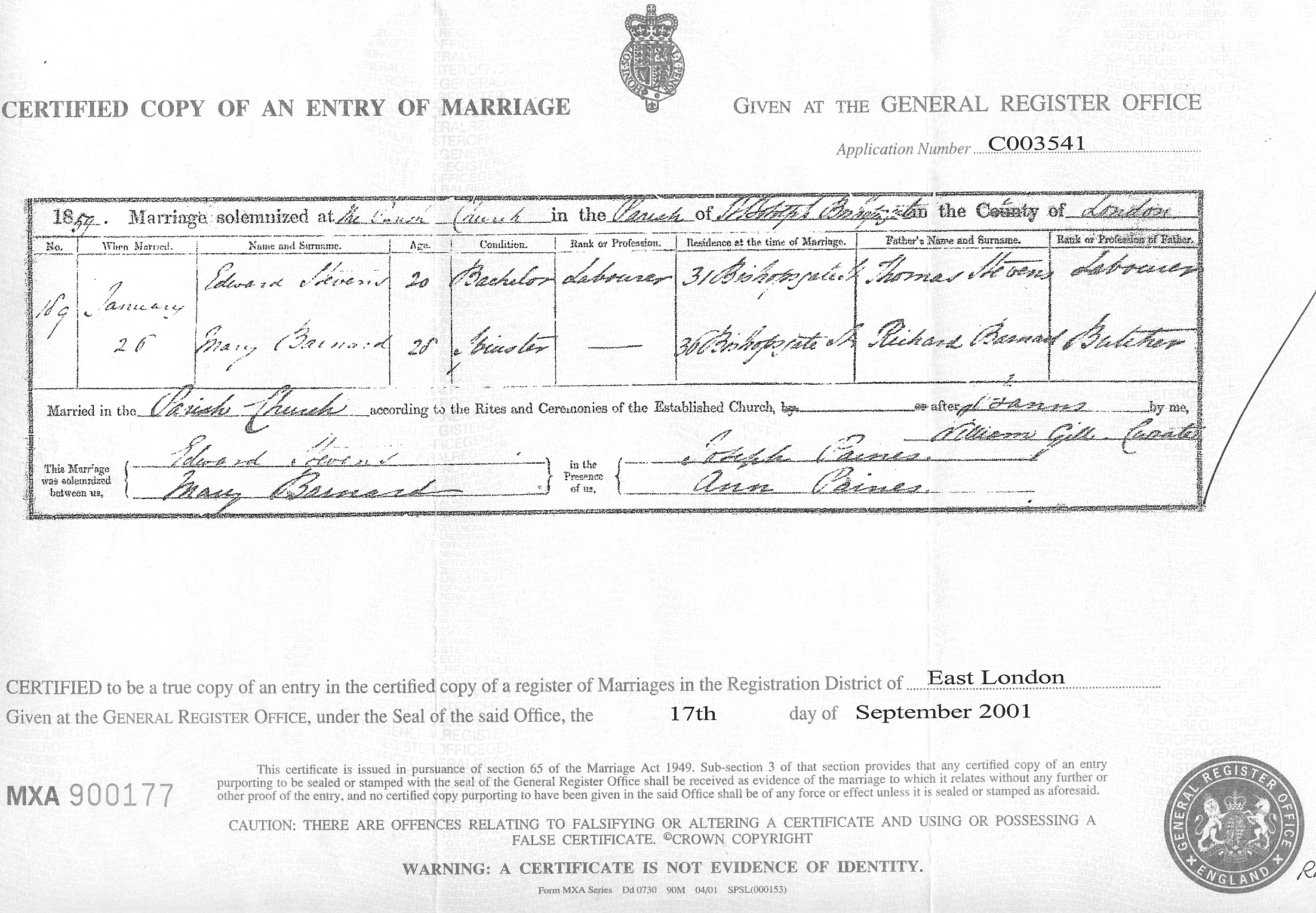 England and Wales, marriage certificate for Edward Stevens and Mary Barnard, married January 26, 2009; citing 1c/30/189, March quarter 1859, E London registration district, St. Boltophs sub-district; General Register Office, Southport. Cit. Date: Sep 2001. Cit. ID: MXA 900177, Surety: 4; 1859 the parish church parish st. boltolphs,bishopsgate, london