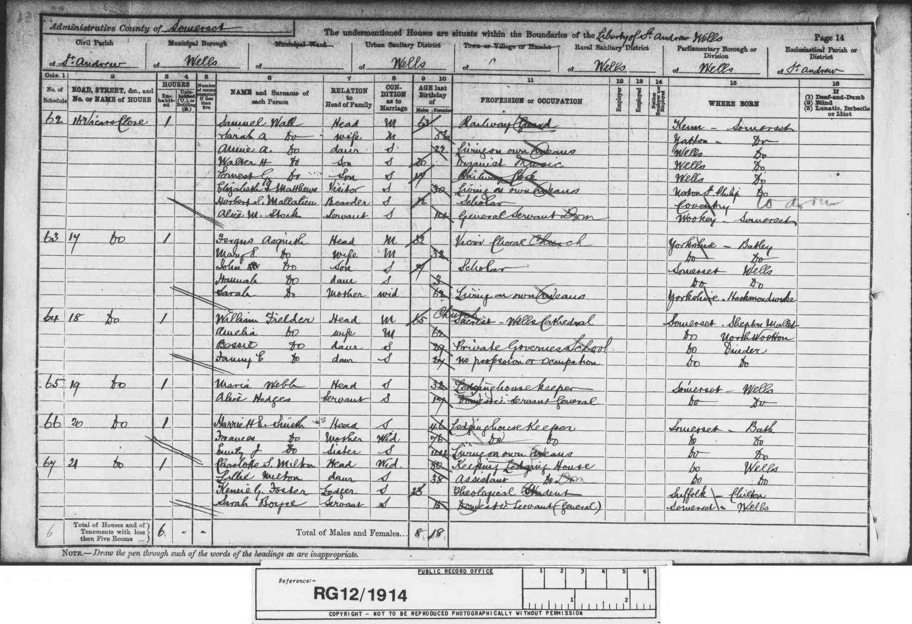 • Lived at: 17 Vicars Close, 1891, Wells, Somerset.