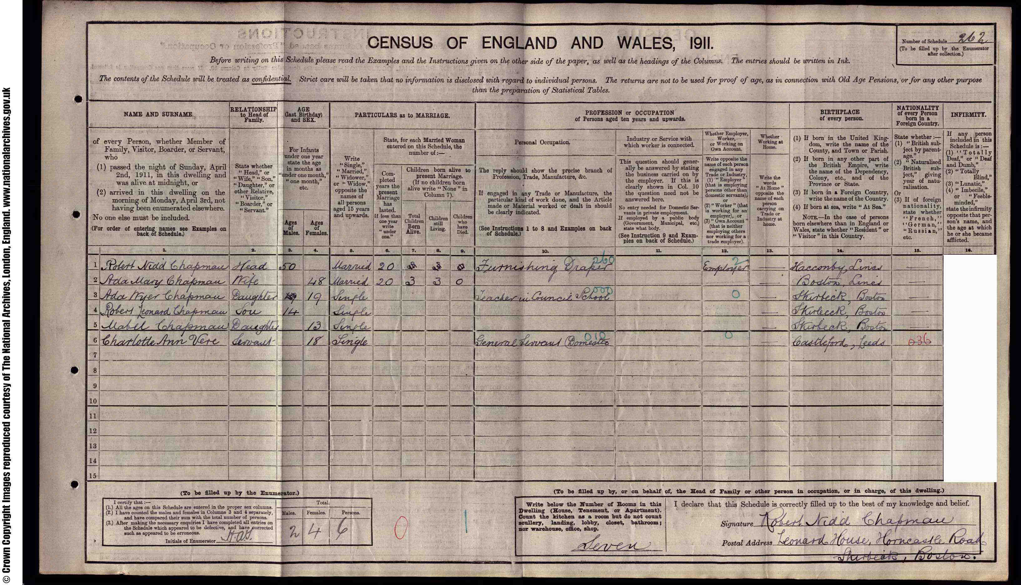 • Lived at: Horncastle Road, 1901, Skirbeck, Lincolnshire, England. • Occupation: Carpet Warehouse Manager, 1901, Skirbeck, Lincolnshire, England. • Lived at: Leonard House, 1911, Boston, Lincolnshire, England.