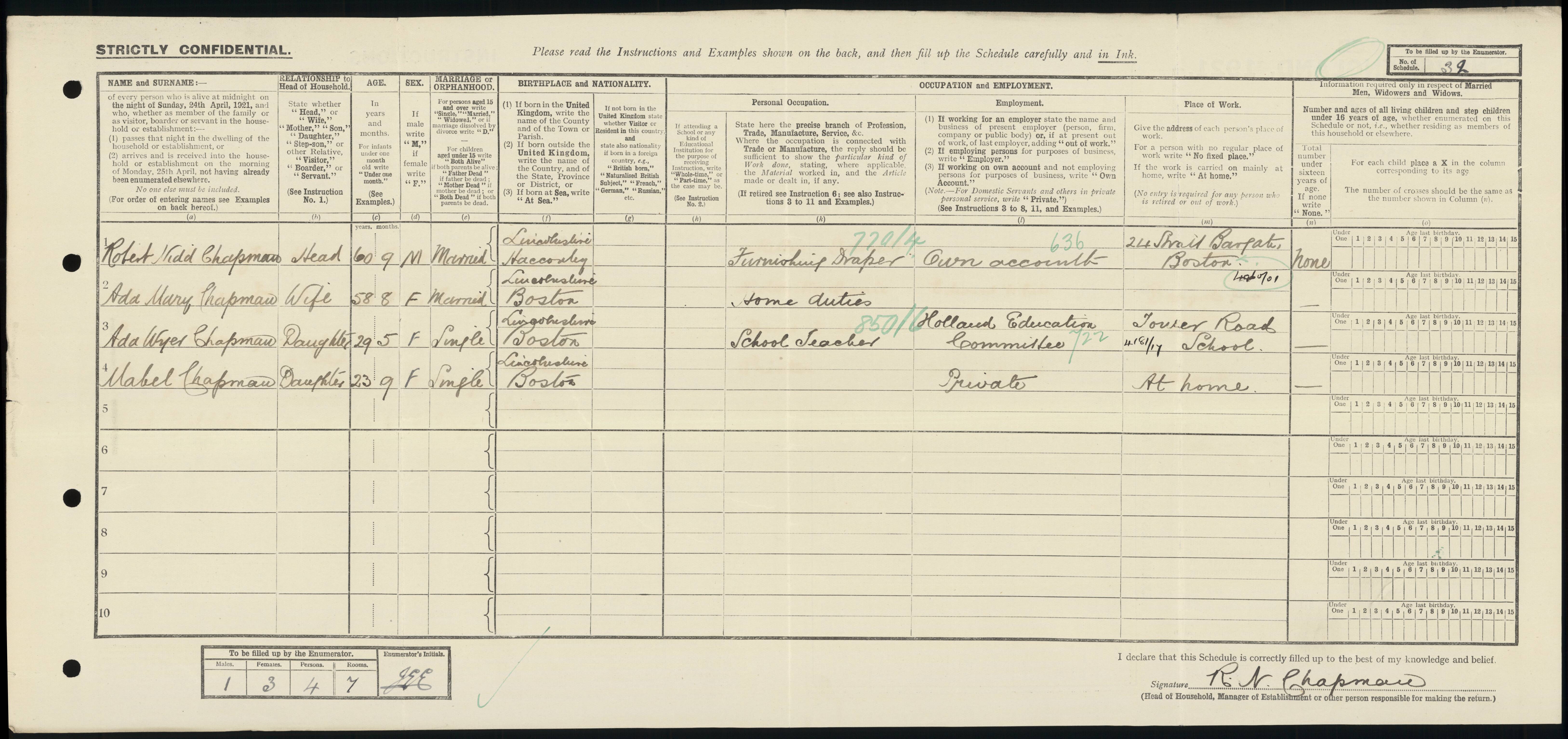 • Occupation: Furnishing Draper, 1911-1921, Horncastle, Lincolnshire, England.