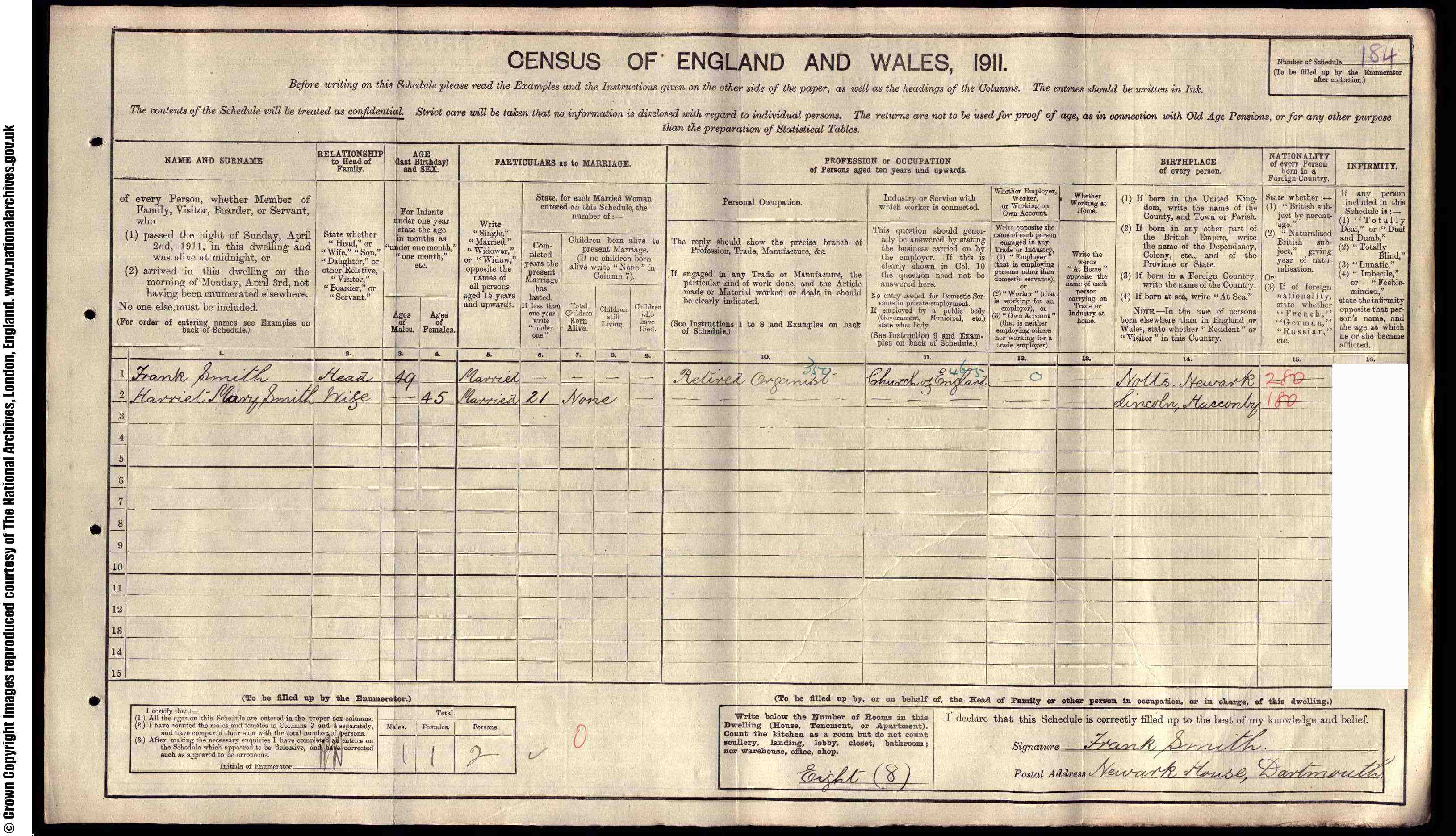 • Lived at: Newark House, 1911, Dartmouth, Devon. Harriet married Frank Smith on 17 Sep 1889 in Swinstead, Lincolnshire, England. (Frank Smith was born circa 1862 in Newark, Nottinghamshire and died after 1911.) |