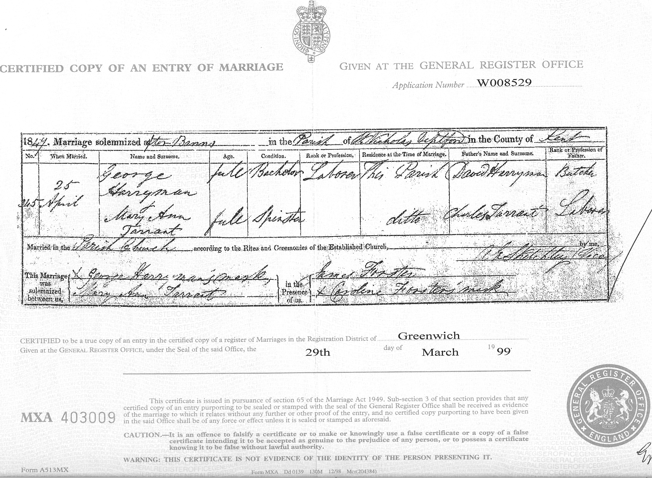 England and Wales, marriage certificate for George Harryman and Mary Ann Tarrant, married April 25; citing 5/283/345, June quarter 1847, Greenwich registration district, Greenwich sub-district; General Register Office, Southport. Cit. Date: Mar 1999. Cit. ID: MXA 403009, Surety: 4; 1849 after banns parish of st. nicolas deptford, kent
