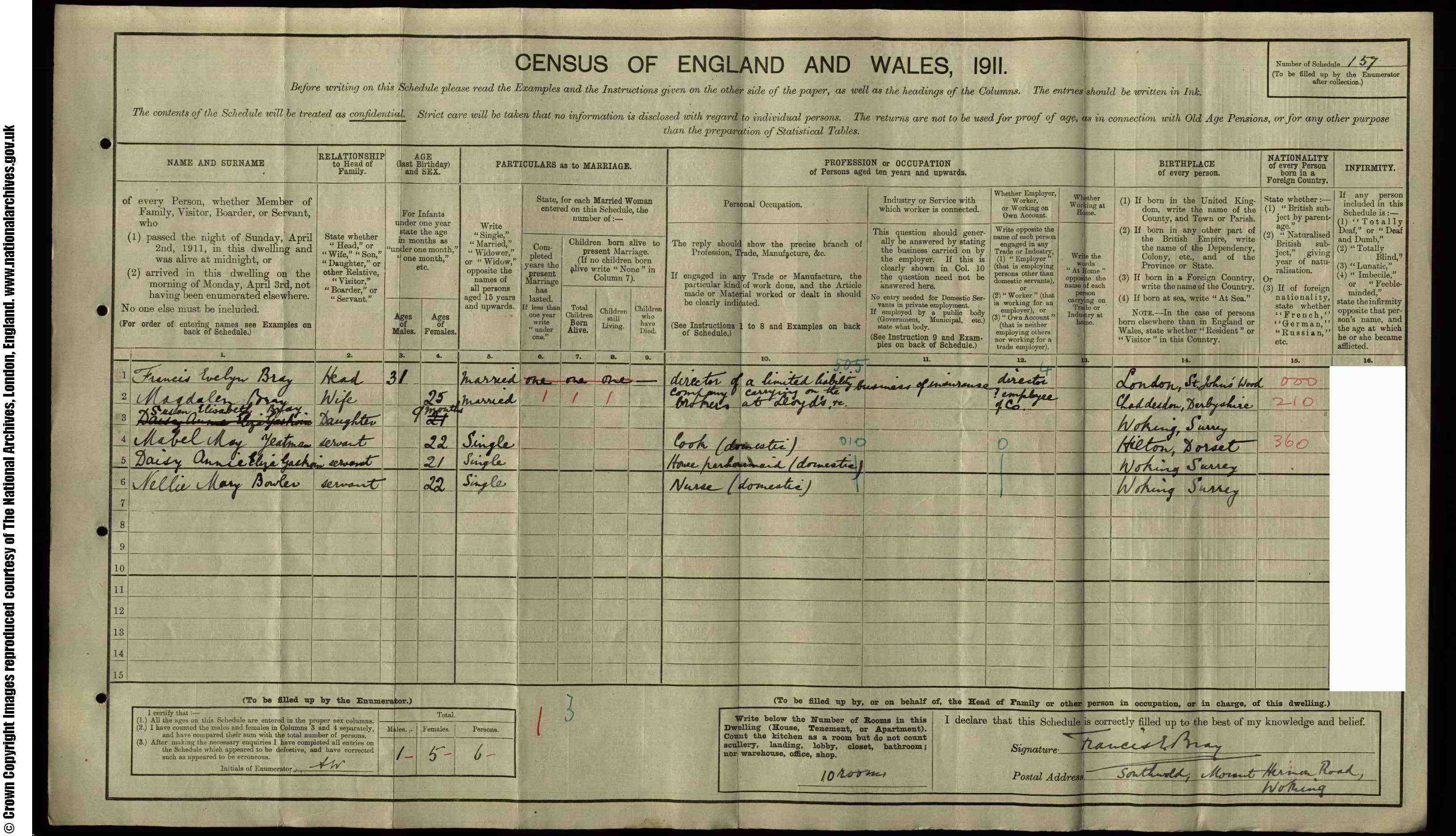 • Occupation: Domestic Cook, 1911, Guildford, Surrey, England. • Lived at: 27 Cliddesden Road, 1921, Basingstoke, Hampshire, England. boarded with Mr. bradfield
