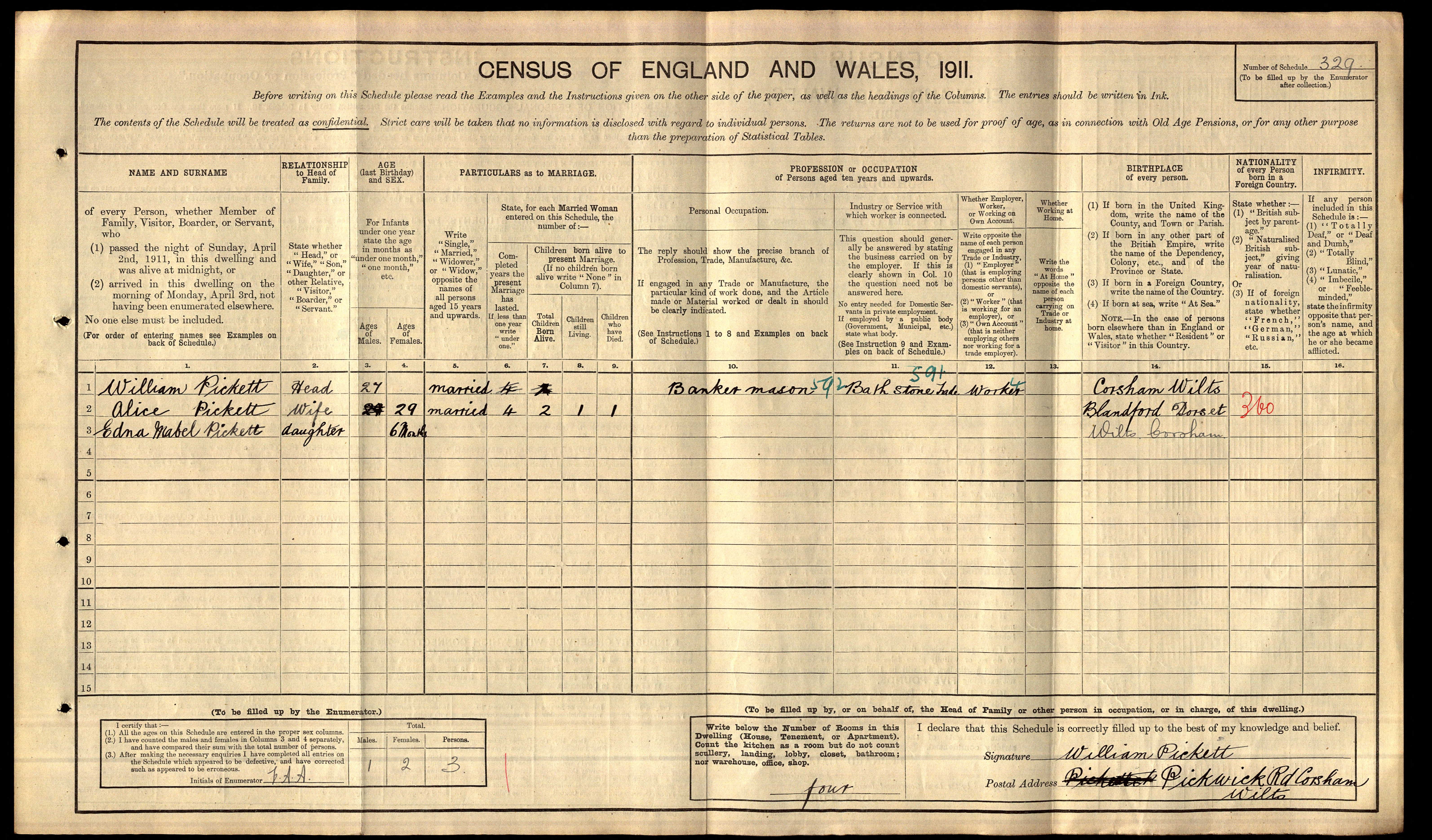 • Lived at: Pickwick Road, 1911, Corsham, Wiltshire. Alice married William John Pickett circa 1906 in Corsham, Wiltshire. (William John Pickett was born circa 1886.) |
