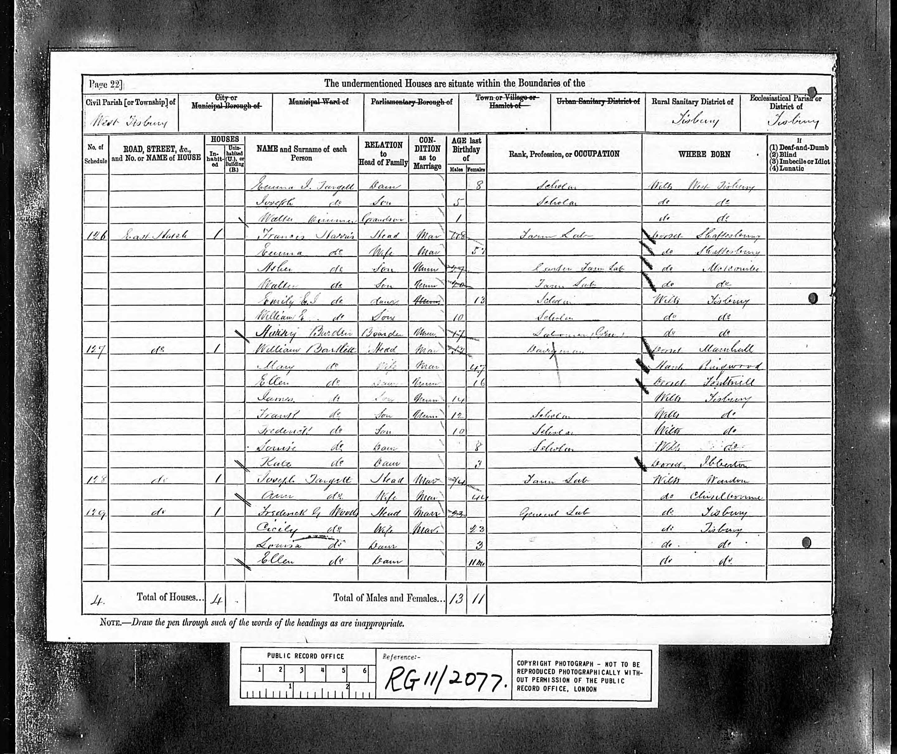 (1881 English and Welsh Census(London, TNA/Ancestry.co.uk, 1982) , Web site showing copies of original enumerator schedules) ID: CEN 1881, CEN 1881 rg11 2077 page 22. Repository: Not Given. Cit. Date: 19 Oct 2005. Cit. ID: CEN 1881 rg11 2077 page 22. Surety: 3.