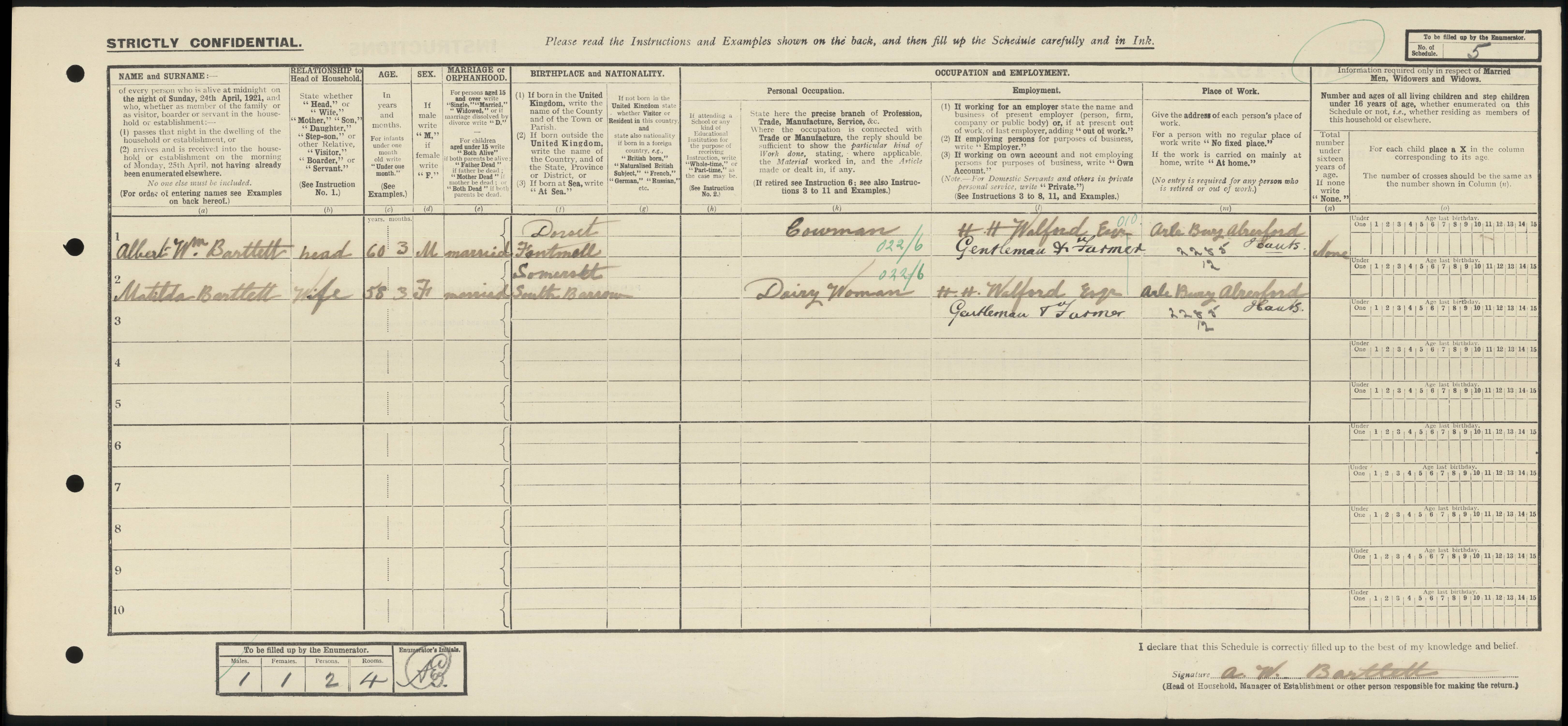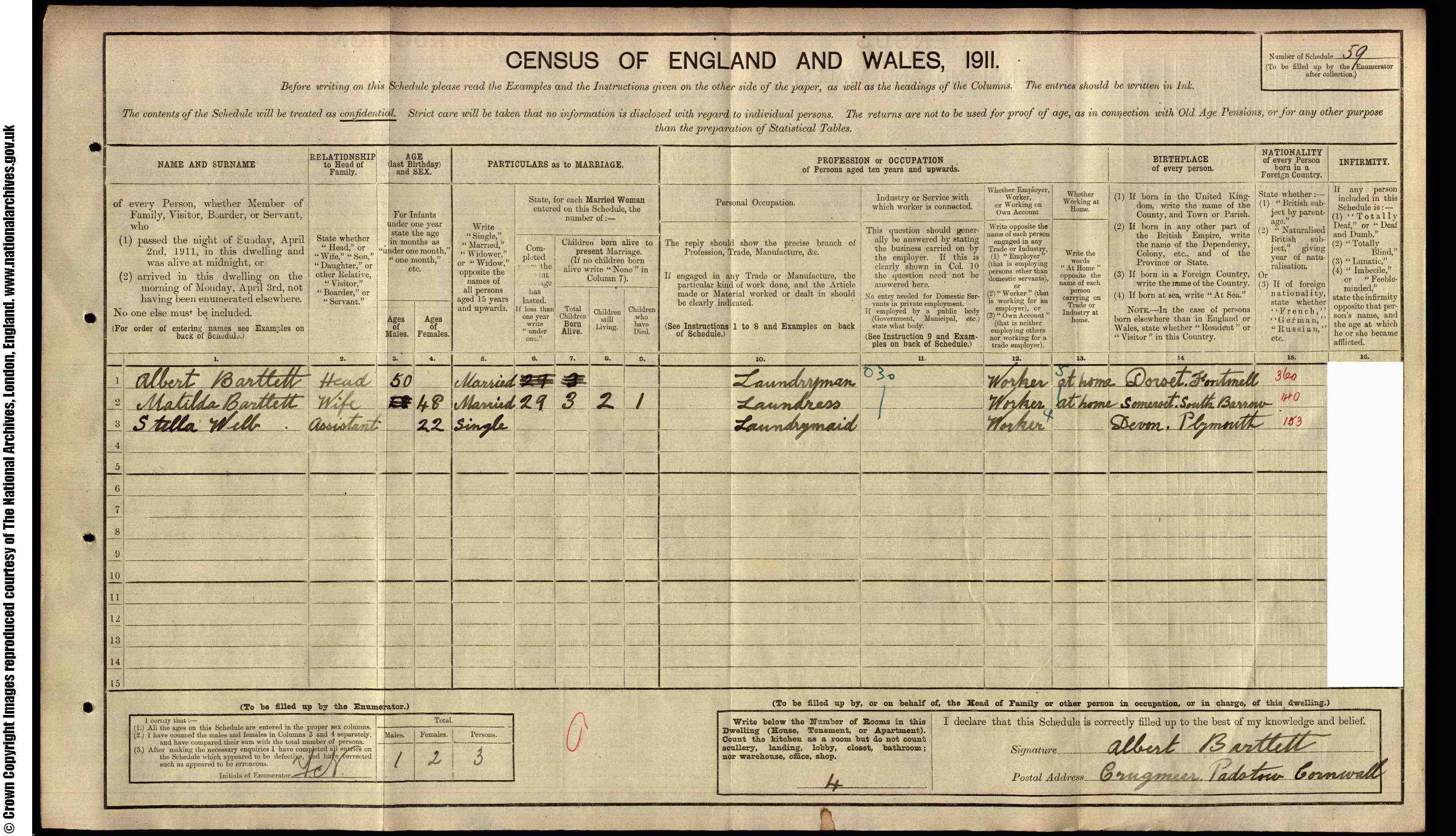 • Lived at: Fontmell, 1881, Dunwester, Dorset. 2 • Lived at: shean's House, 1881, South Barrow, Somerset. • Occupation: Dairyman, 1881, South Barrow, Somerset. 3 • Lived at: 2 Cole Lane, 1891, Horne. 1 4 • Occupation: Dairyman, 1891, Horne. 1 4 • Lived at: Clare House, 1901, Oundle, Hartney Witney, Hampshire. 1 5 • Occupation: Stockman on Farm, 1901, Oundle, Hartney Witney, Hampshire. 1 5 • Lived at: Crugmeer, 1911, Padstow, Cornwall. • Occupation: Laundryman, 1911, Padstow.