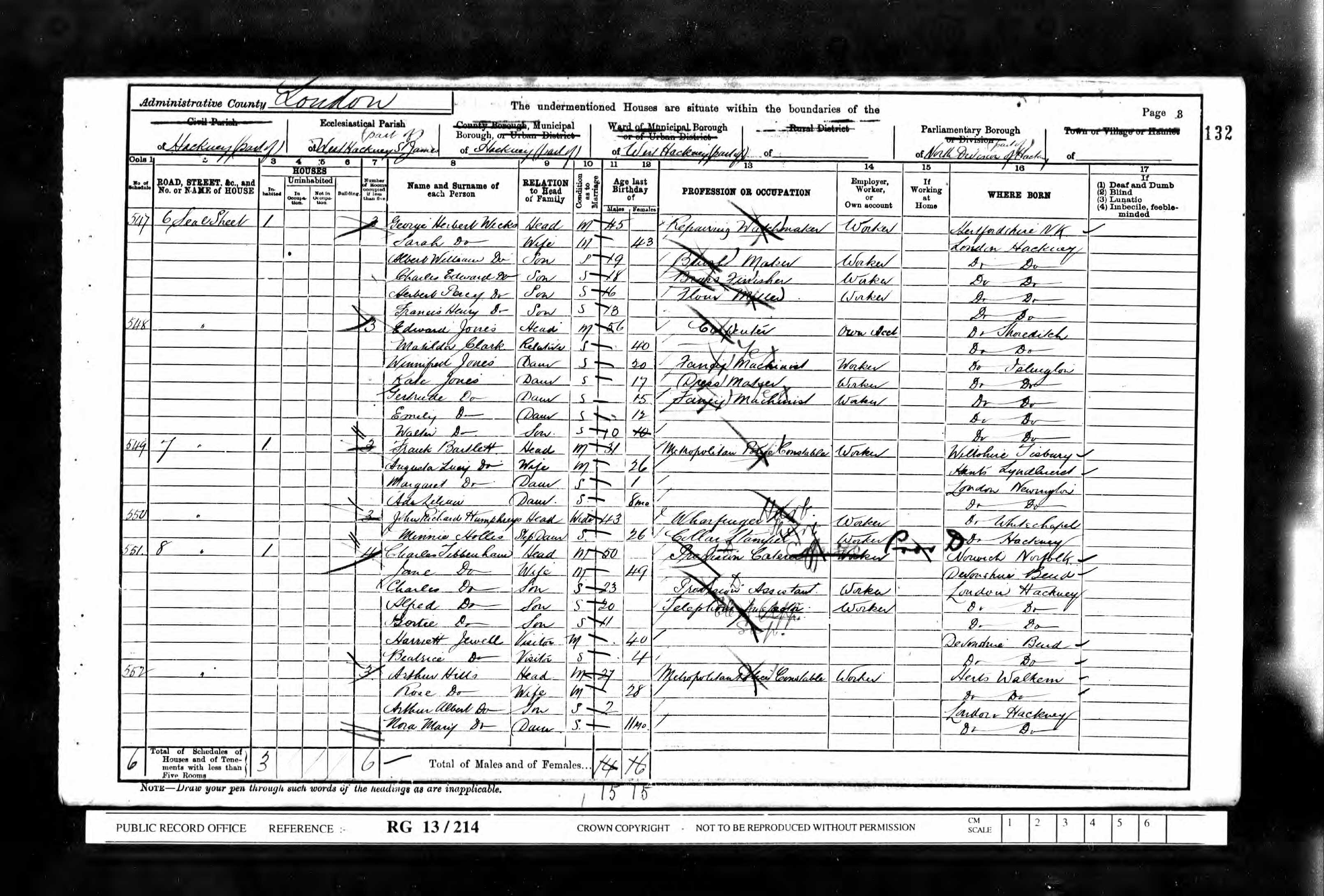 (1901 English and Welsh Census(London, TNA/Ancestry.co.uk, 2002) , Web site showing copies of original enumerator schedules) ID: CEN 1901, CEN 1901 rg13 214 132 3. Cit. Date: 23 Oct 2005. Cit. ID: CEN 1901 rg13 214 132 3. Surety: 3.
