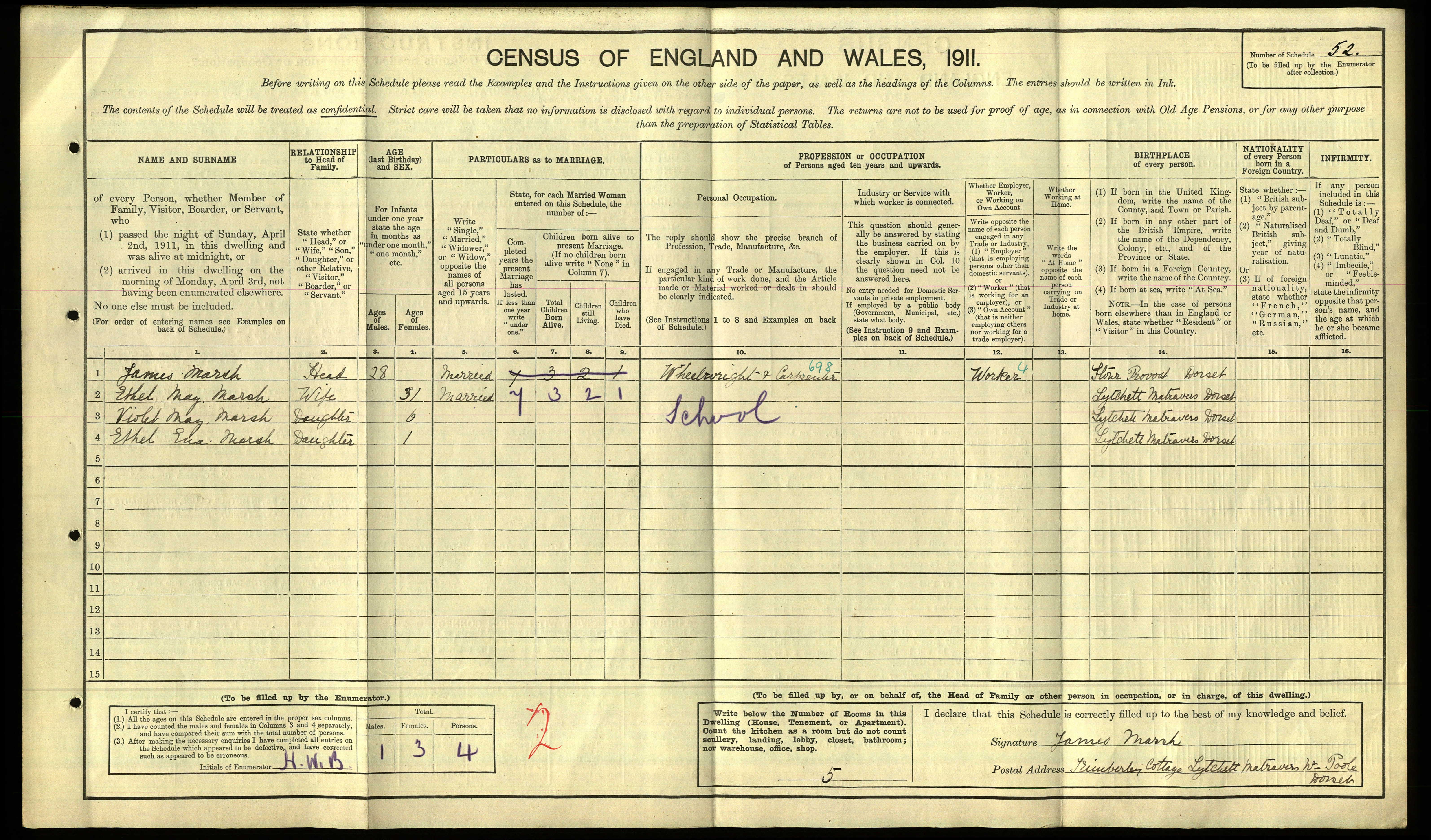 • Occupation: Wheelwright and Carpenter, 1911, Lytchett Matravers, Dorset.