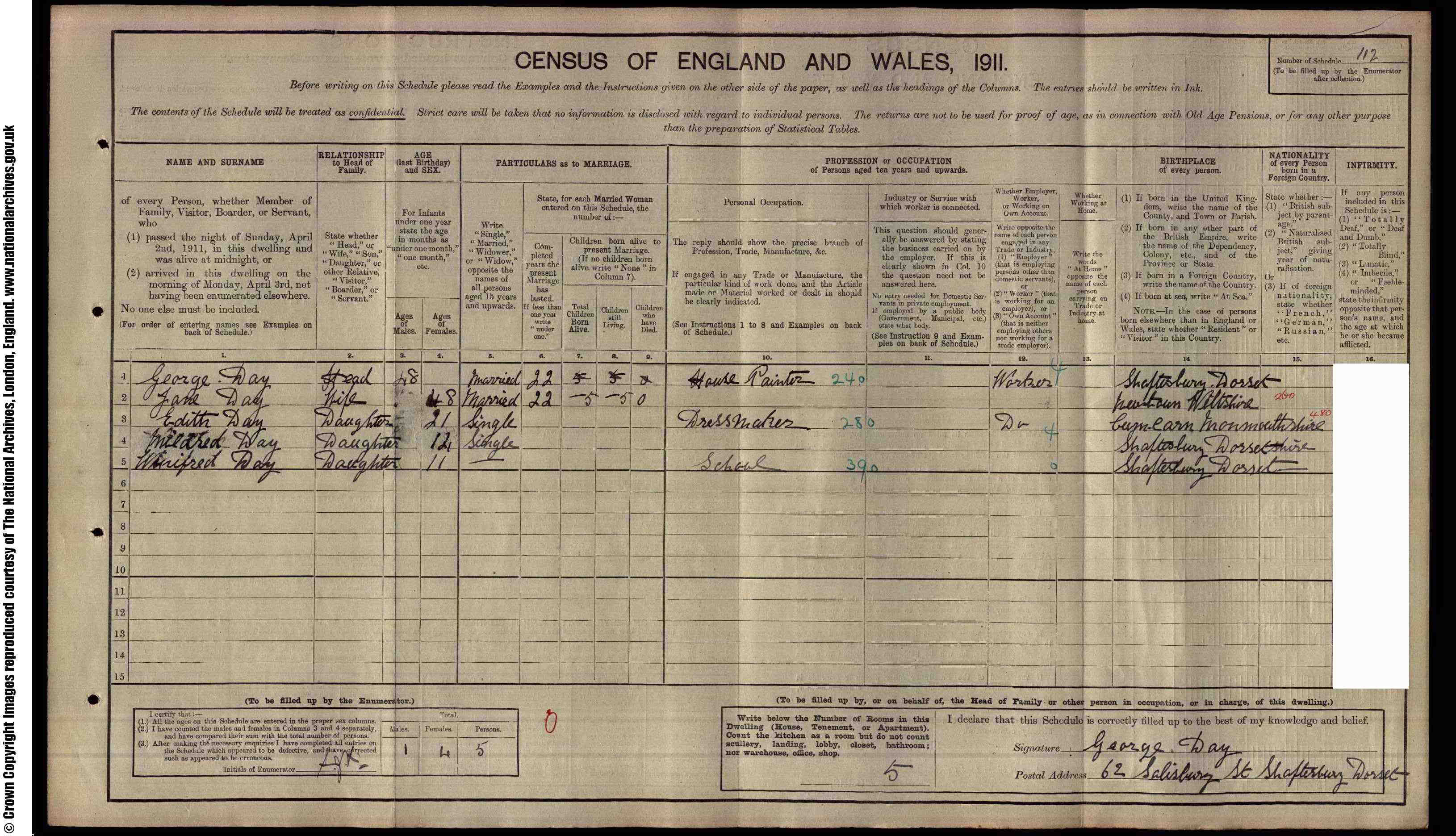 • Lived at: 62 Salisbury Street, 1911, Shaftesbury, Dorset, England.