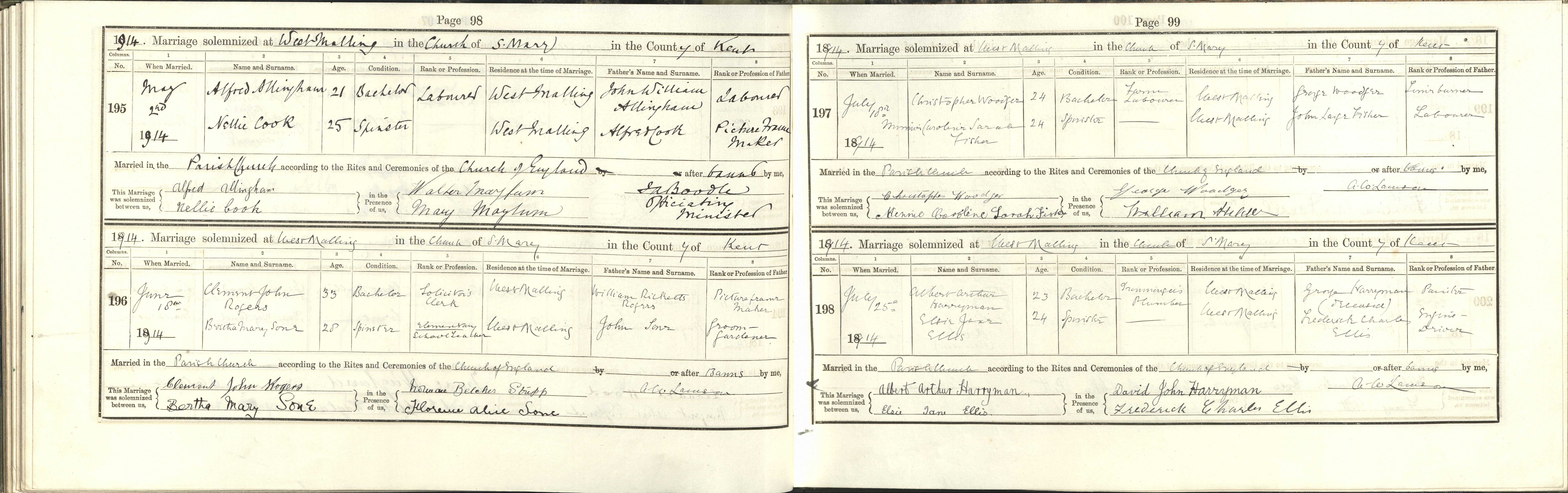 2 : Apr 2001. ID: WEB, http://www.west-malling.co.uk/V2/baptisms.php5. Cit. Date: 2 Aug 2010. Surety: 3. 18 Mar 1891 Albert Arthur Harryman George Mary Ann Malling Painter 03 May 1891 88 697.