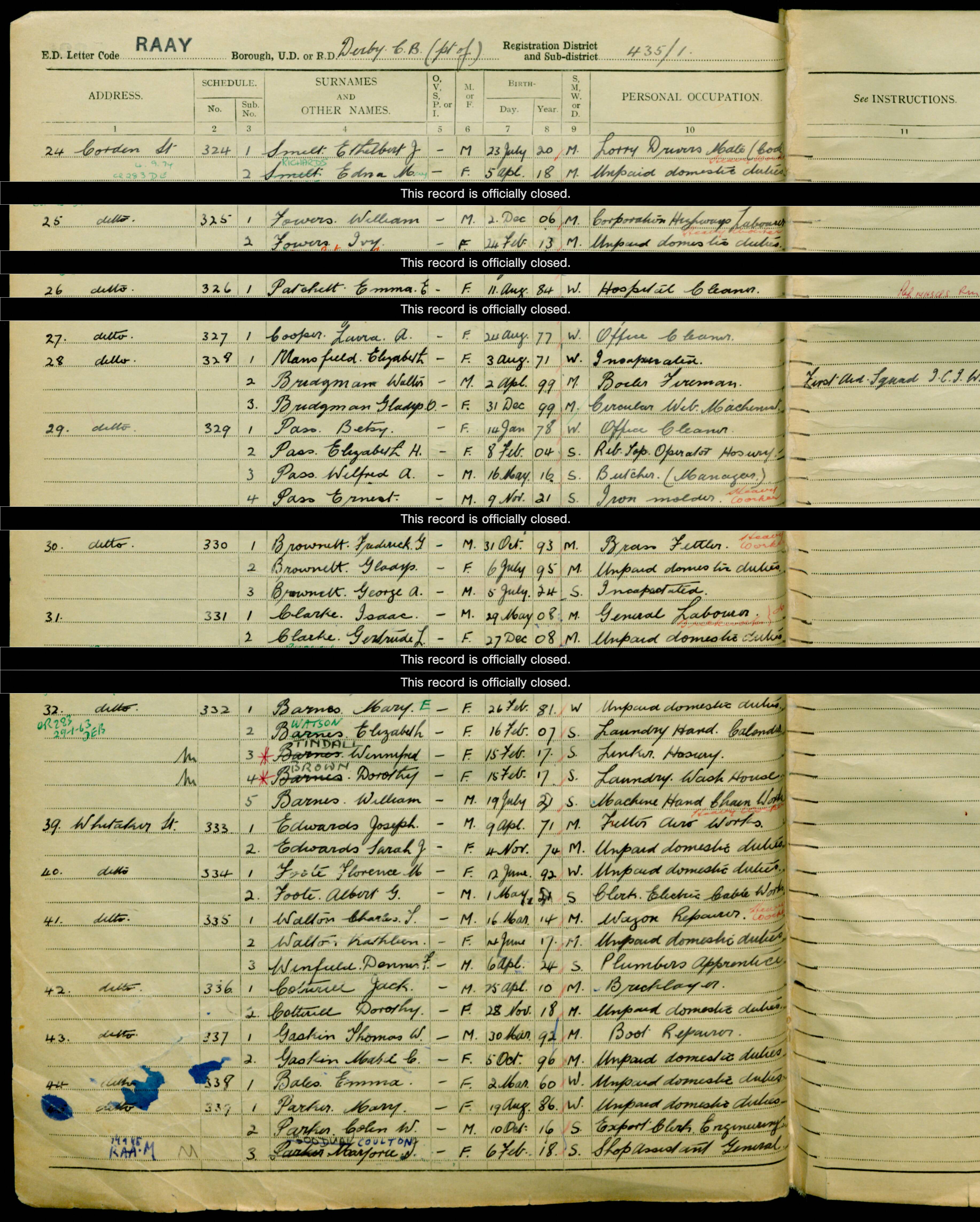 • Lived at: 40 Whitaker Street, 1939, Derby, Derby C.B., Derbyshire, England. Florence married Arthur Henry Foote on 12 Jun 1920 in Shaftsbury, Dorset. (Arthur Henry Foote was born circa 1894 and died before 1939.) |