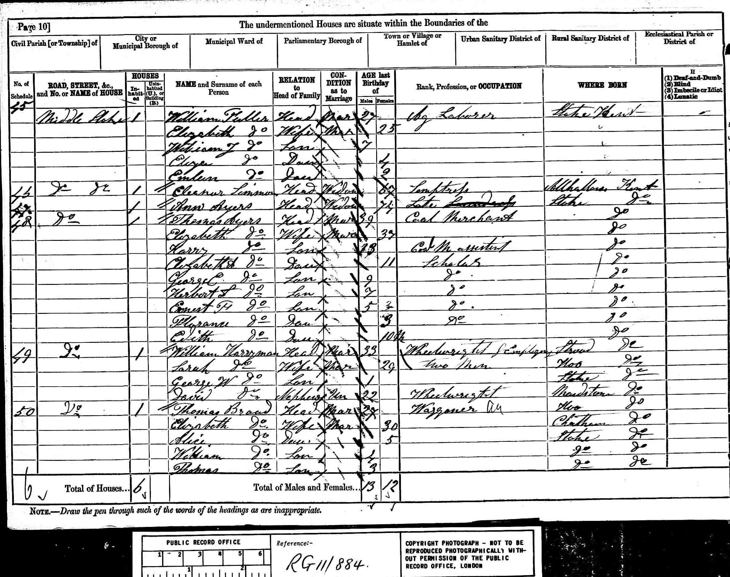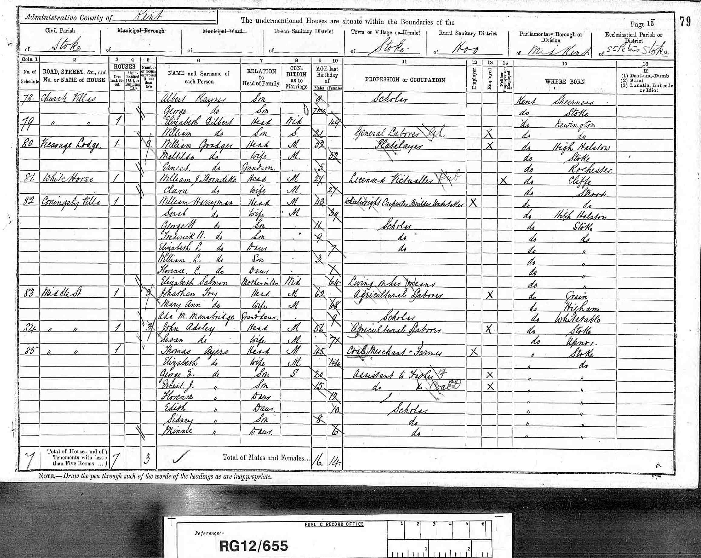 (1891 English and Welsh Census(London, TNA/Ancestry.co.uk, 1992) , Web site showing copies of original enumerator schedules) ID: CEN 1891 RG12, rg12 655 Kent page 12 folio 79. Cit. Date: 25 Jun 2003. Cit. ID: CEN 1891 RG12 655. Surety: 3. stoke stoke hoo Mid Kent St. Peters, Stoke