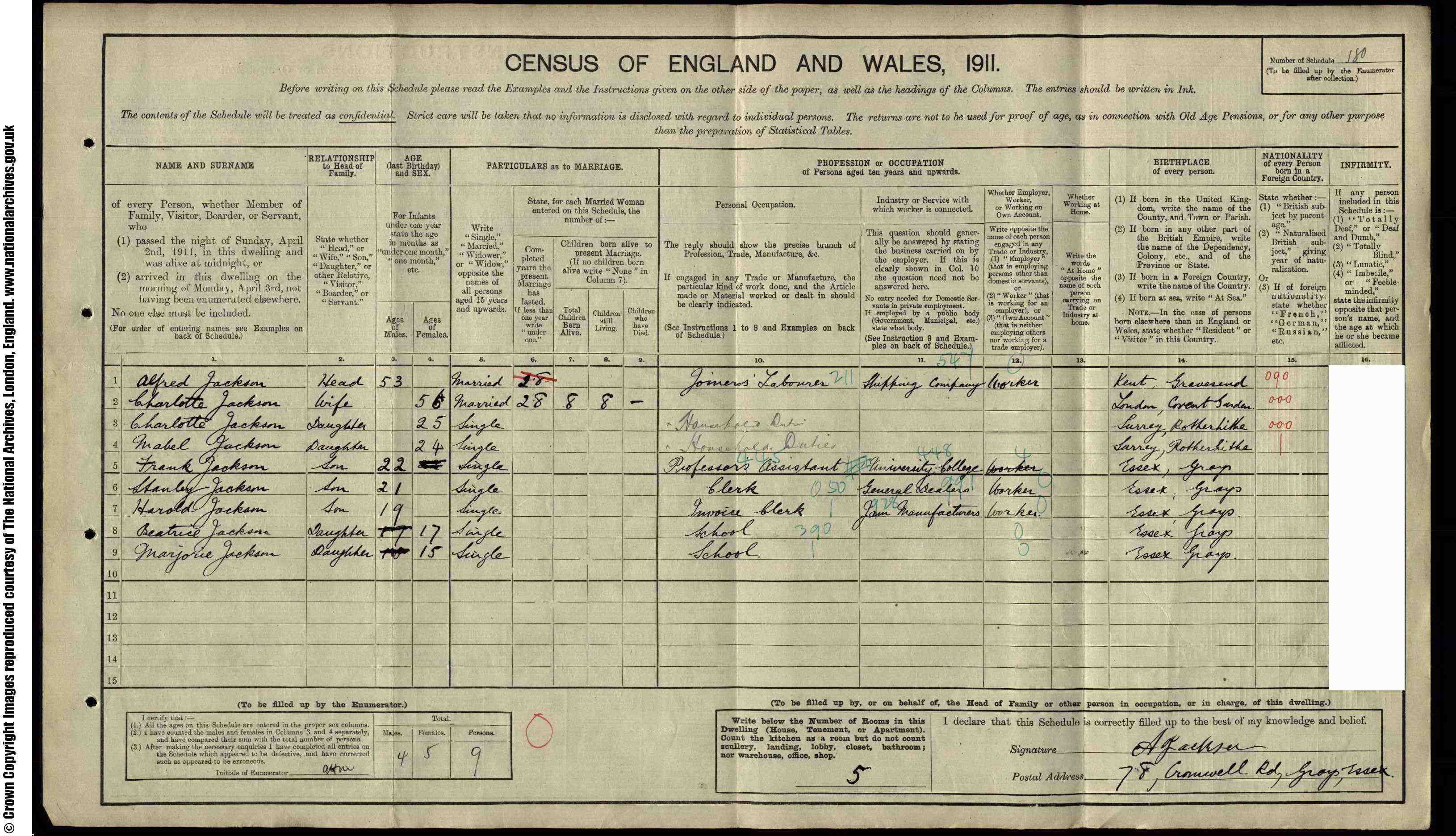 • Lived at: 78 Cromwell Road, 1911, Grays, Essex, England. • Occupation: Professors Assistant at University, 1911, Grays, Essex, England.