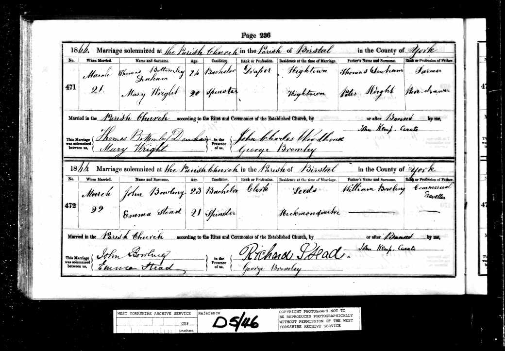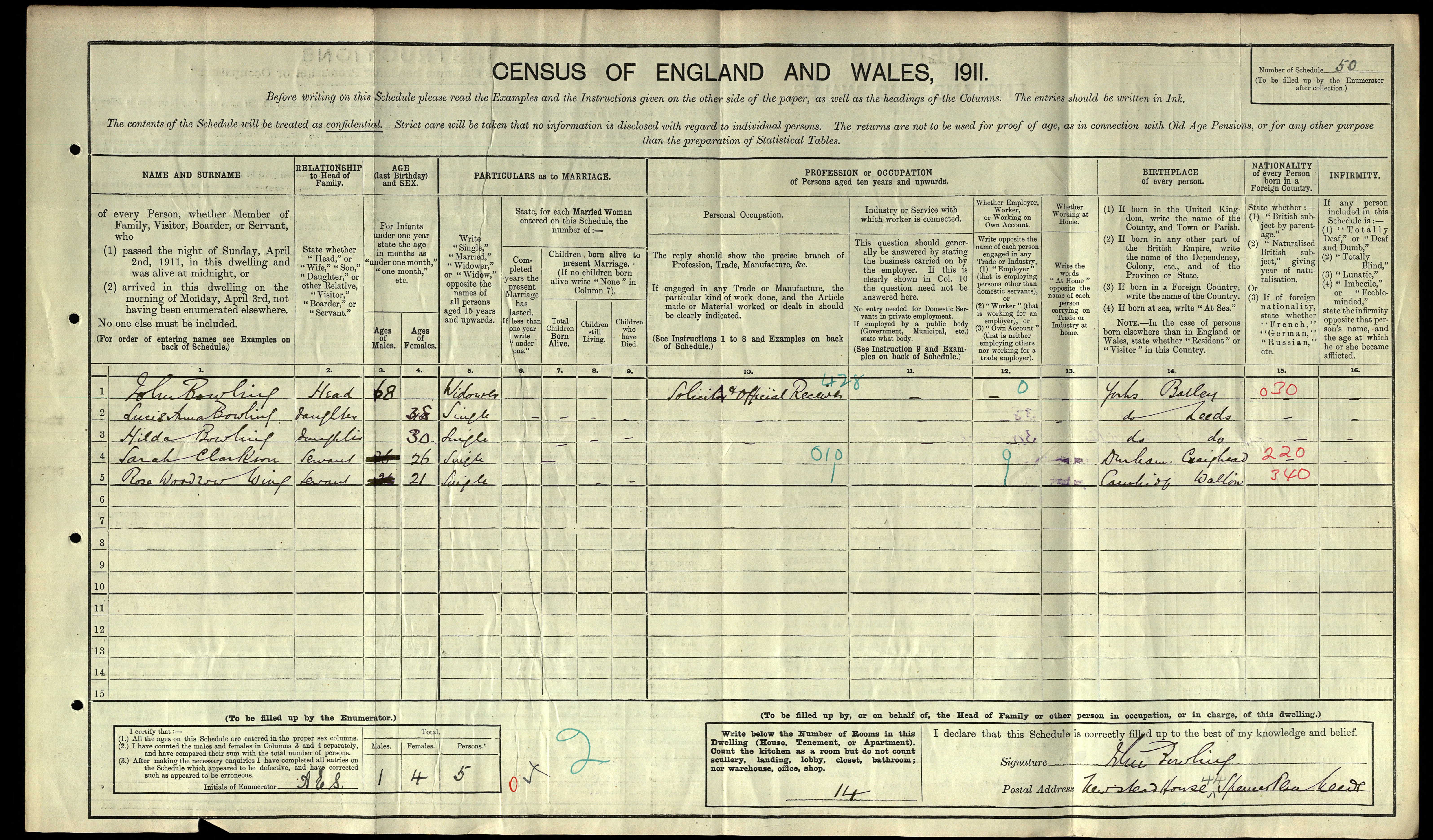 • Occupation: Solicitors Clerk and Receiver, 1911, Leeds. • Lived at: the poplars, 1918, Leeds. • Probate: 16877 pounds, 1918, Leeds. John married Emma Stead on 22 Mar 1866 in Dewsbury, Yorkshire & Yorkshire (West Riding), England. (Emma Stead died between 1901 and 1911.) |