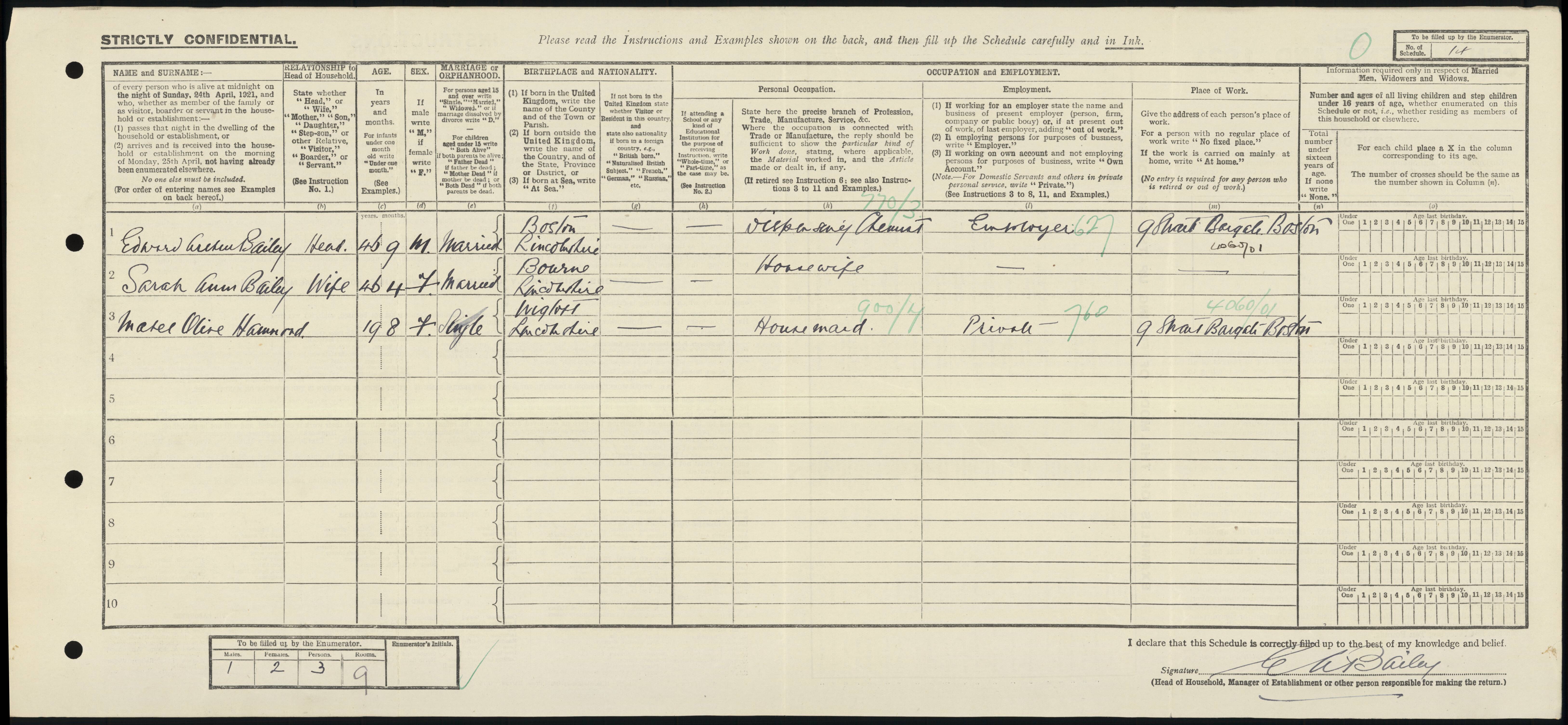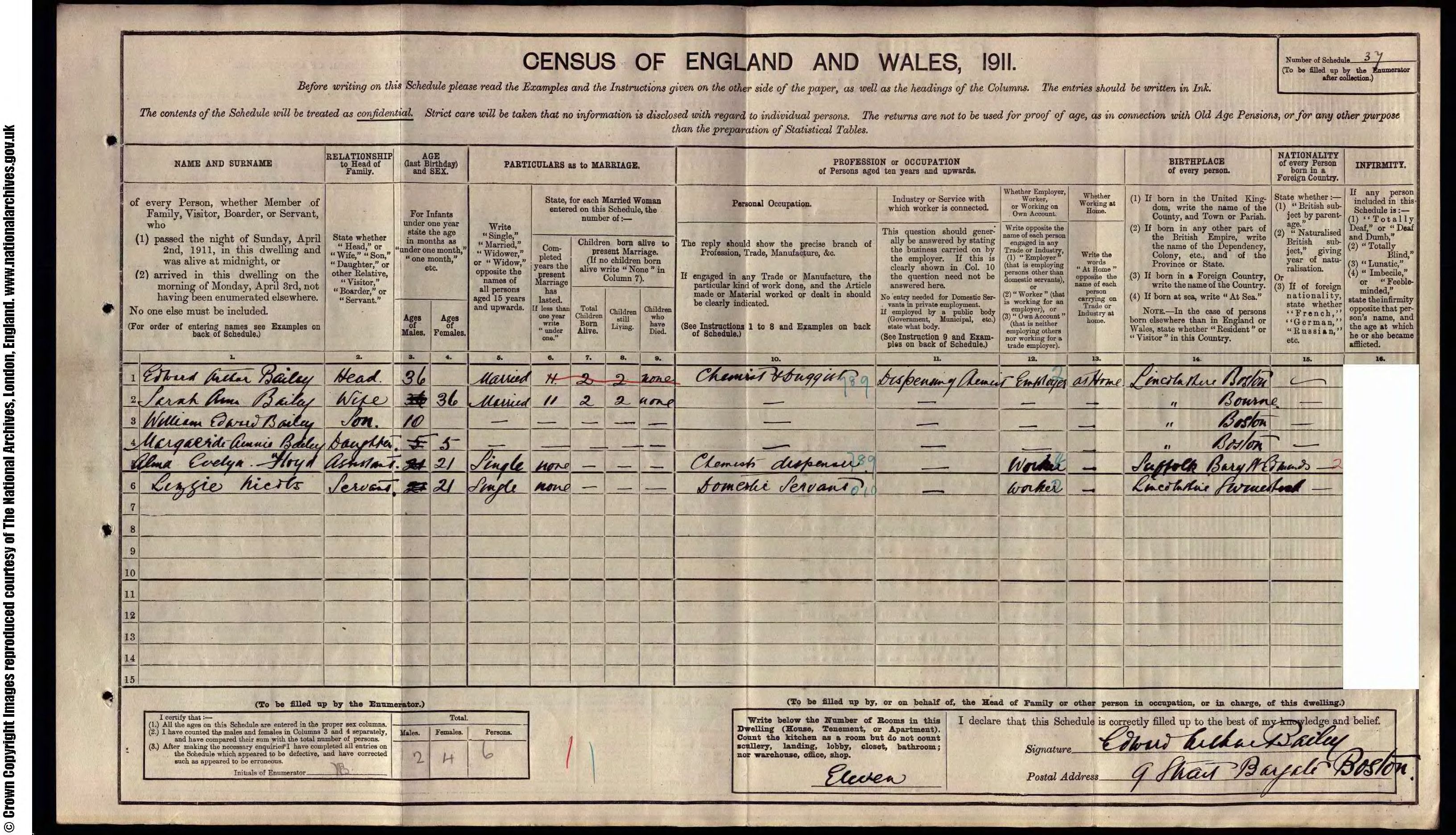 • Lived at: 9 Short Bayale, 1911, Boston, Lincolnshire, England. • Occupation: Chemist and Druggist, 1911, Boston, Lincolnshire, England.