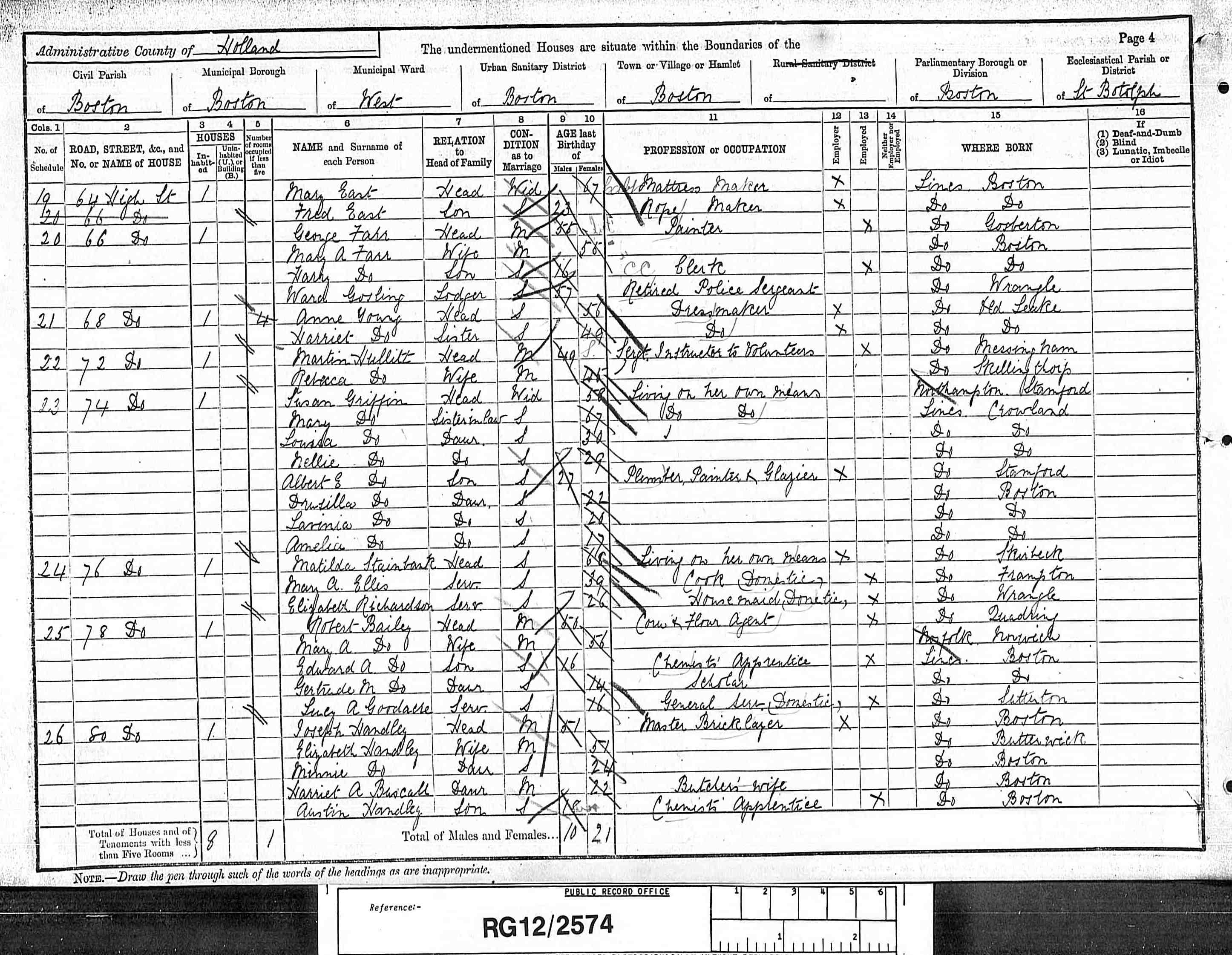 • Lived at: 78 High Street, 1891, Boston, Lincolnshire, England. 2 • Lived at: 10 Tunnard Street, 1901, Boston, Lincolnshire, England. 3